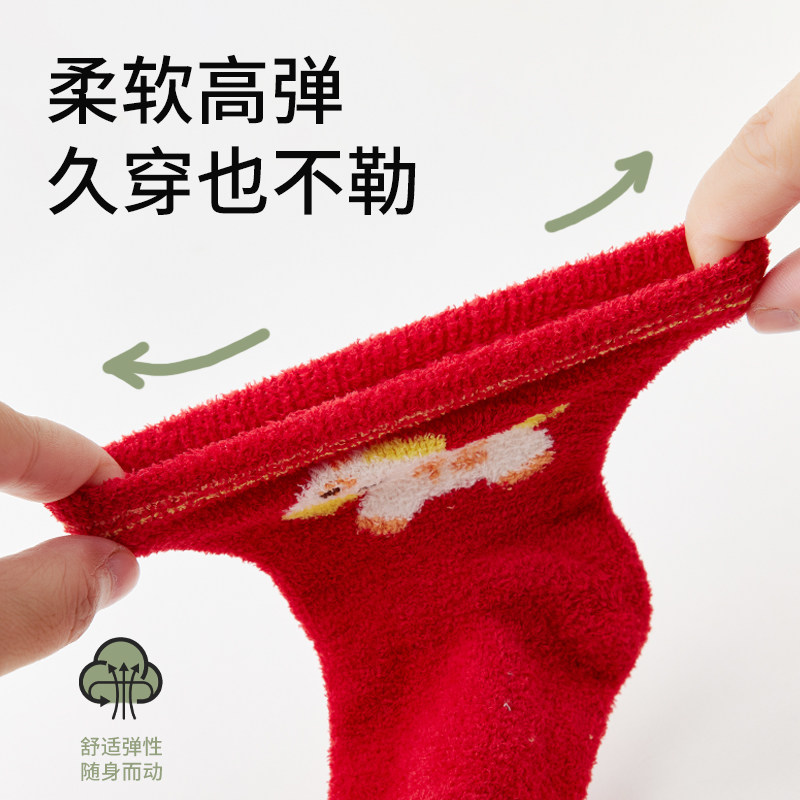 婧麒婴儿袜子秋冬季加厚半边绒红色卡通中筒袜新生儿宝宝新年红袜