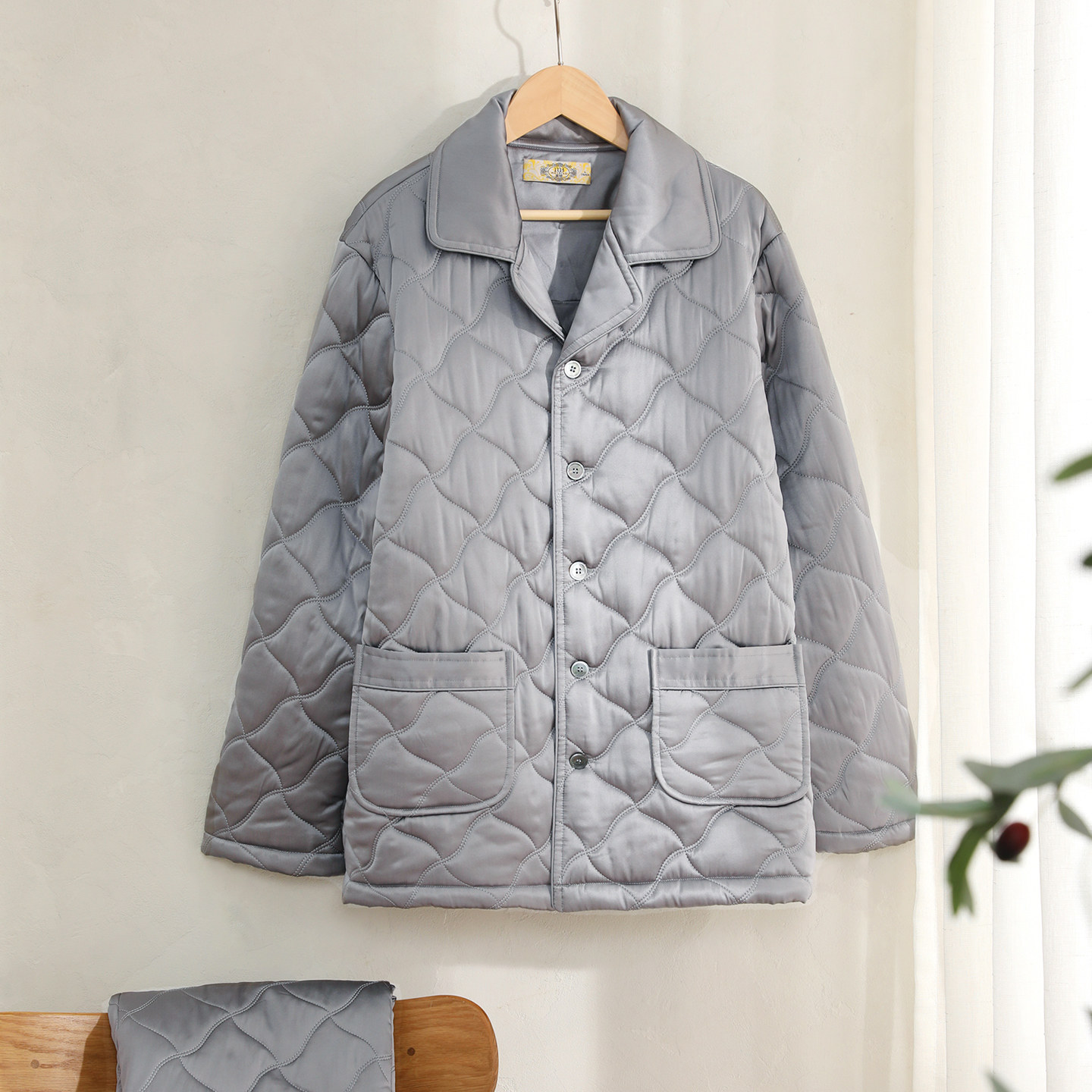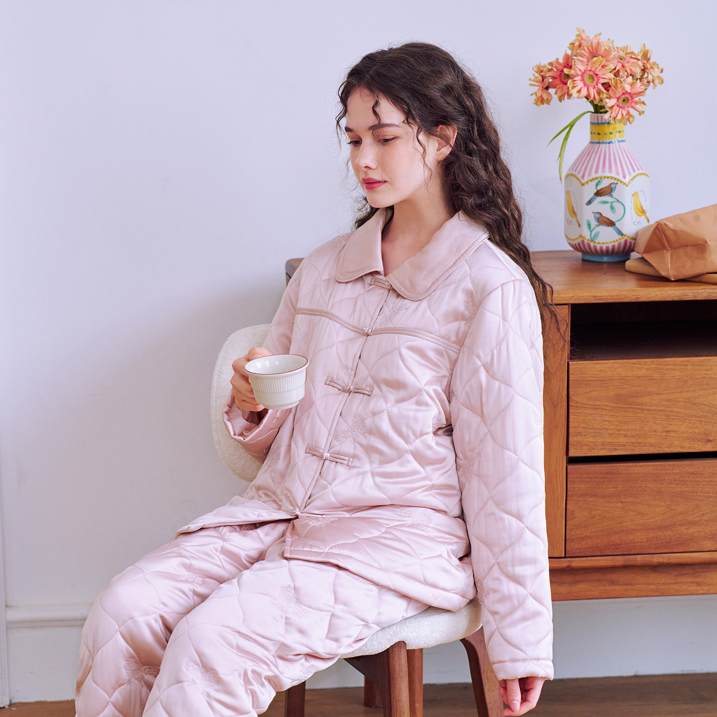 美标秋冬新款三层加厚夹棉真丝睡衣套装情侣休闲丝绸桑蚕丝家居服