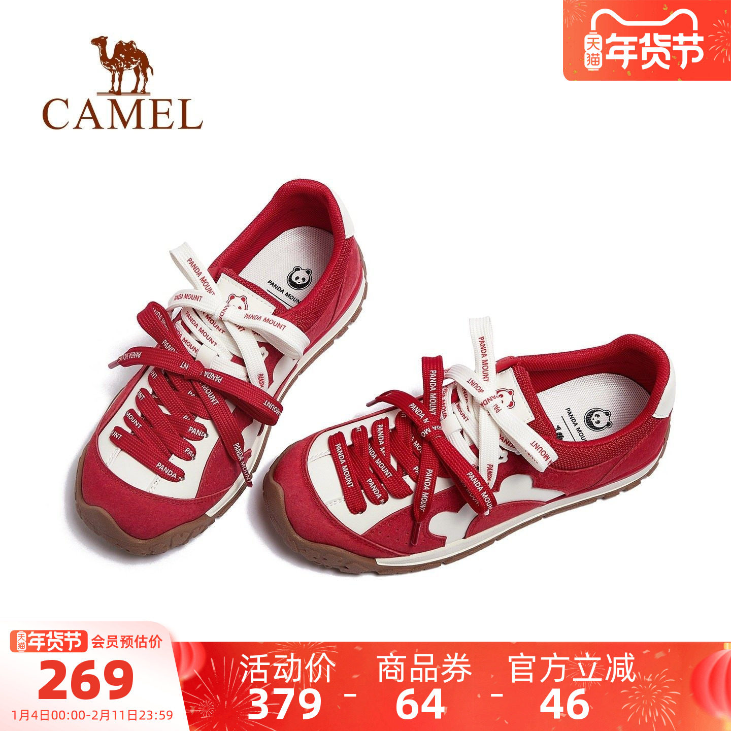 骆驼熊猫德训鞋女鞋2026春季新款新年红色户外休闲运动鞋女阿甘鞋