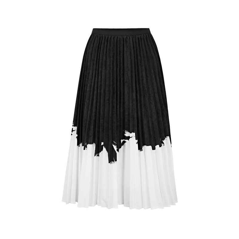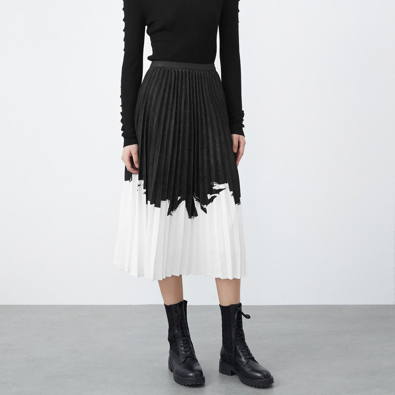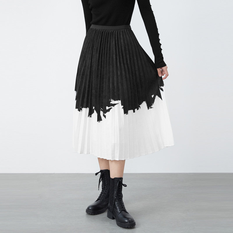 sdeer圣迪奥女装优雅松紧撞色涂鸦不规则百褶A字长裙S21481119