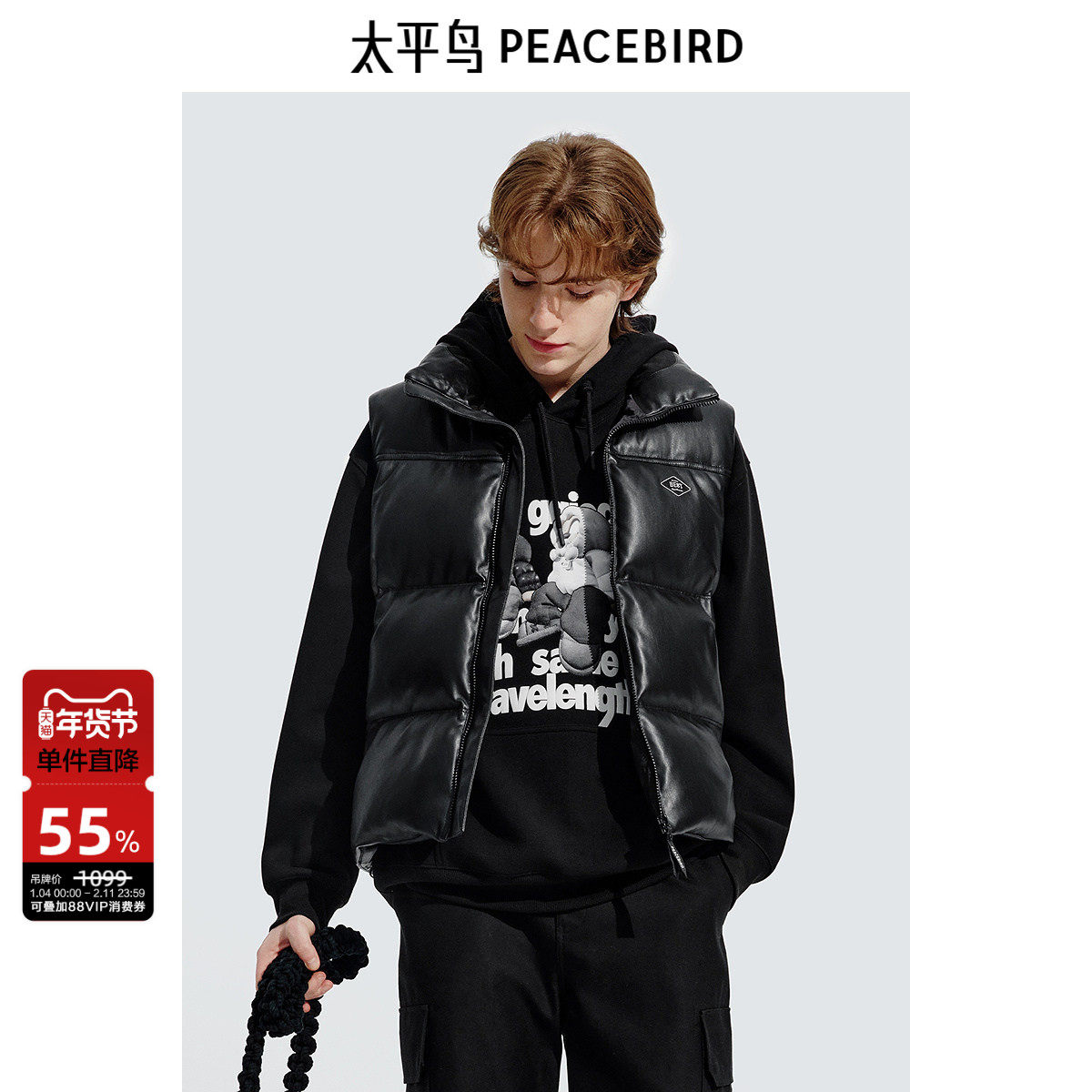 太平鸟男装 字母印花立领马甲外套秋冬PU皮羽绒服马甲潮流