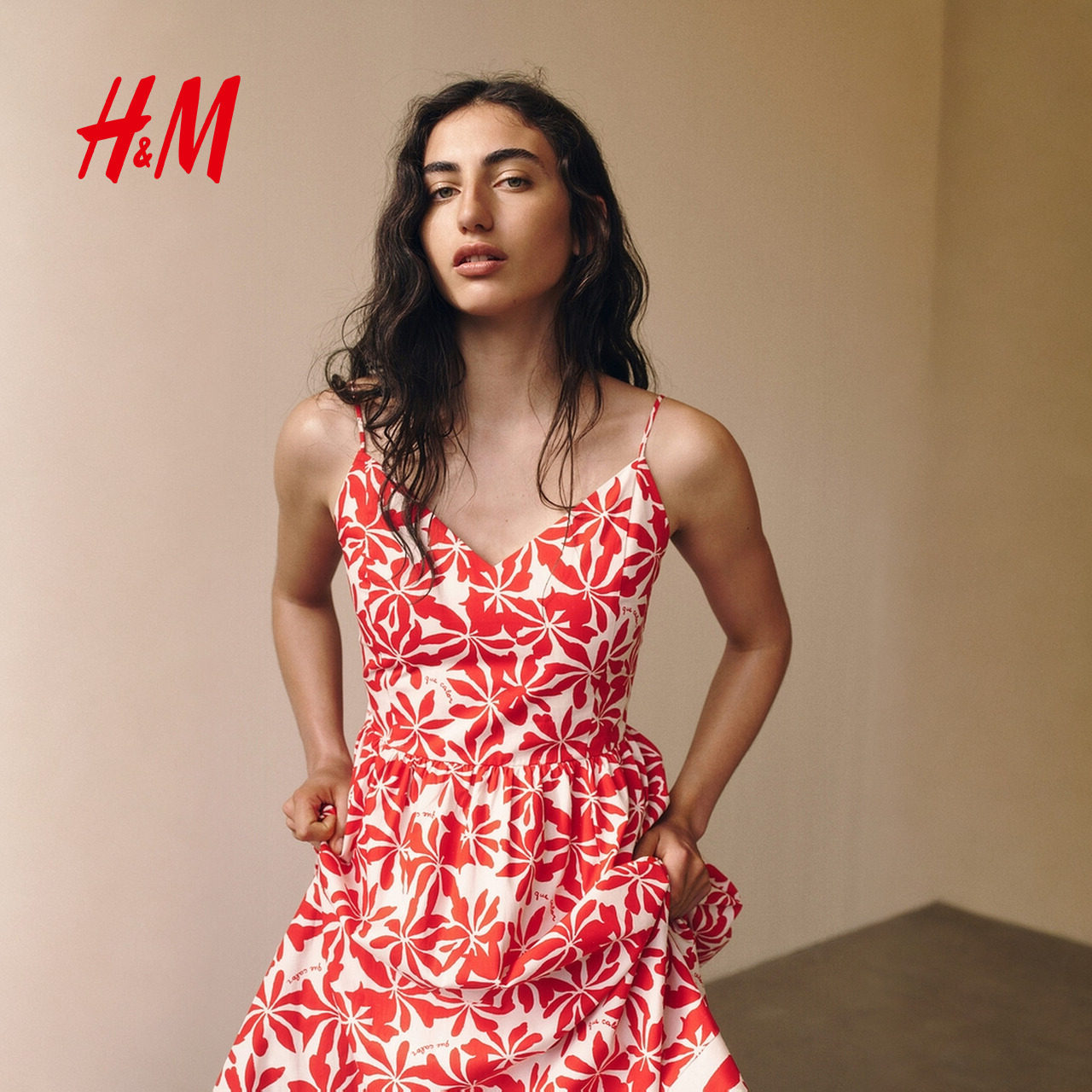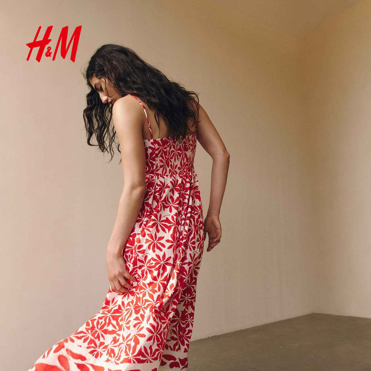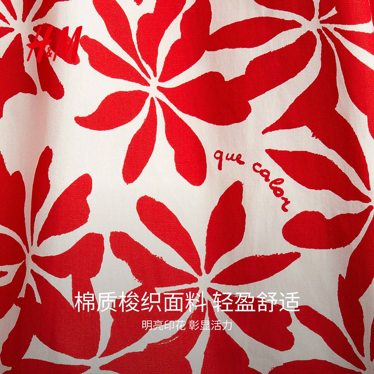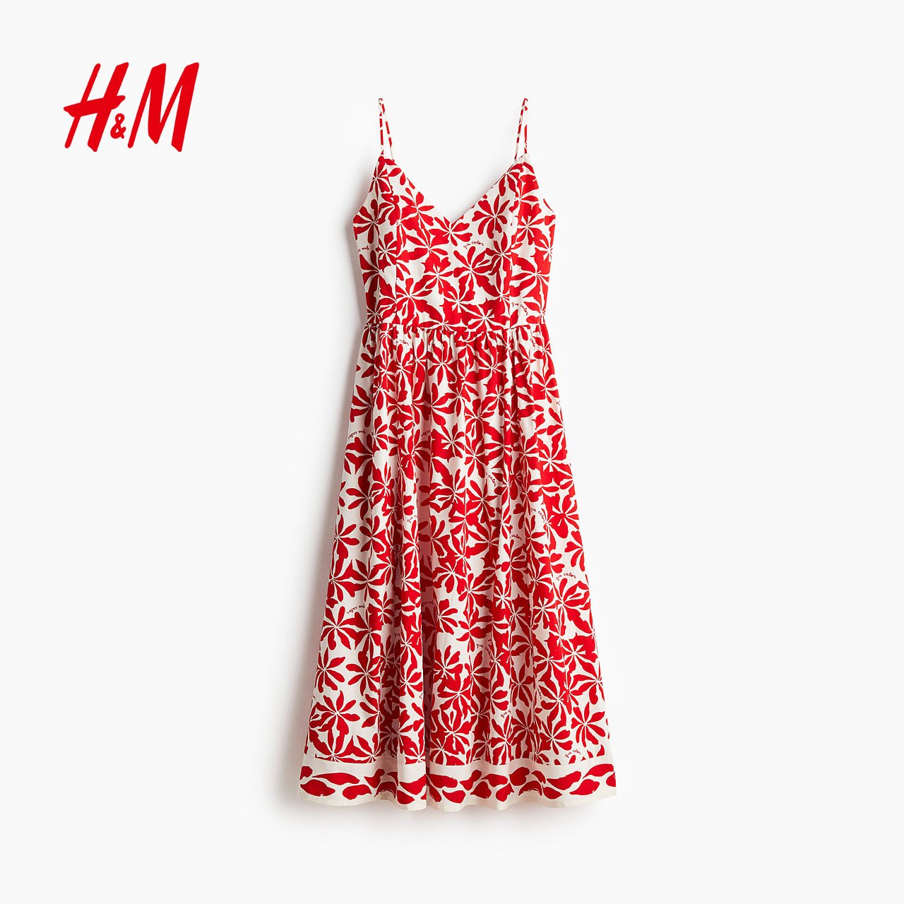 HM女装连衣裙春季新款碎花V领修身度假风吊带植物印花长裙1278036