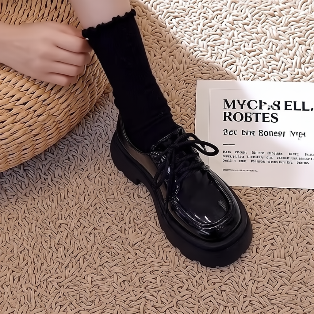新款英伦风小皮鞋乐福鞋女2024春秋厚底百搭系带黑色jk单鞋亮面