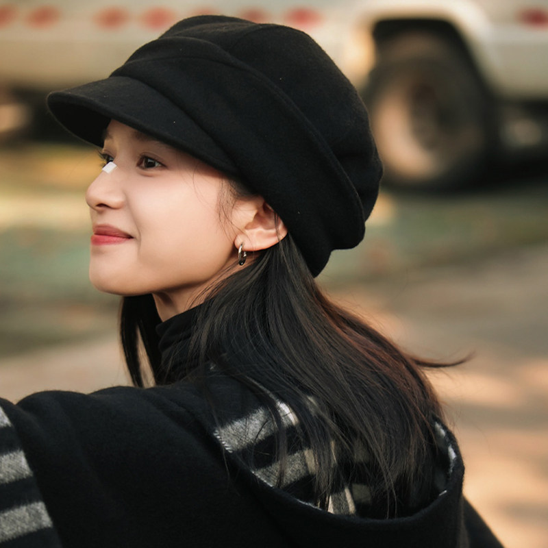 张婧仪同款黑色鸭舌帽女秋冬保暖毛呢贝雷帽高级感复古八角报童帽