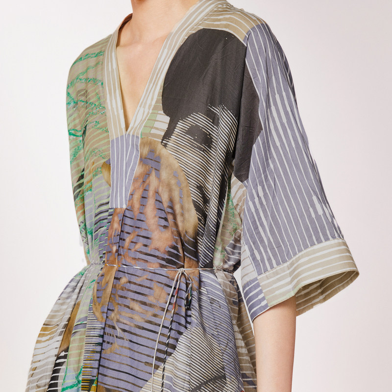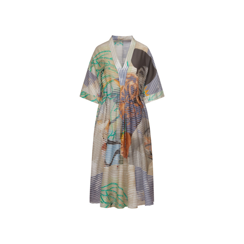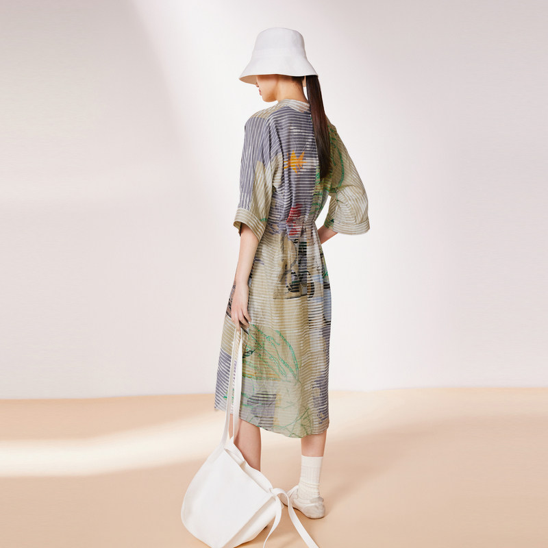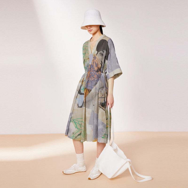 【迅系列】LESS夏人物印花短袖连衣裙女V领收腰宽松裙子2O4G13230