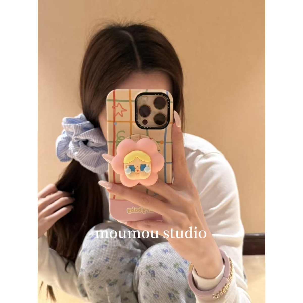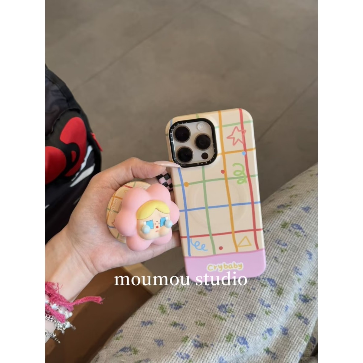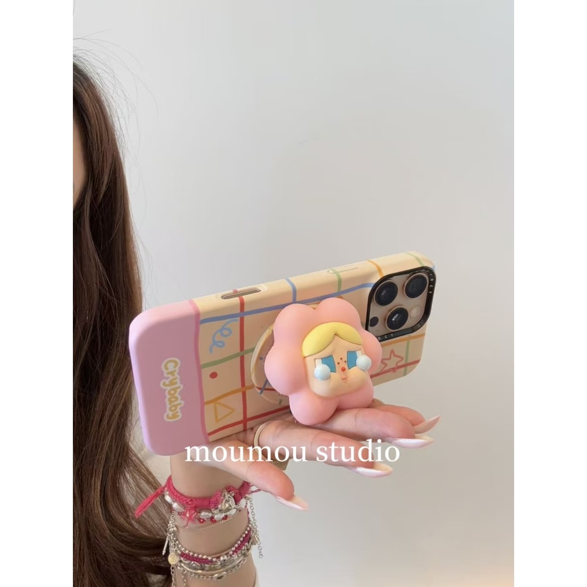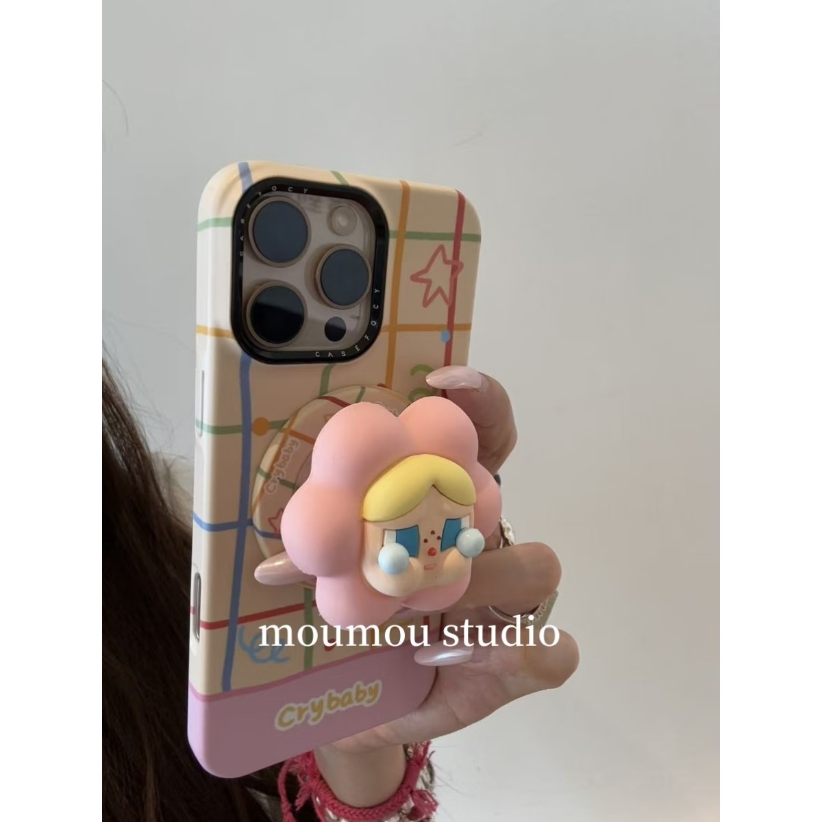 MOMOMOSTUDIOS小众ins彩色格子硅胶哭娃磁吸支架适用iPhone16promax新款15pro苹果手机壳14pro磨砂13半包防摔
