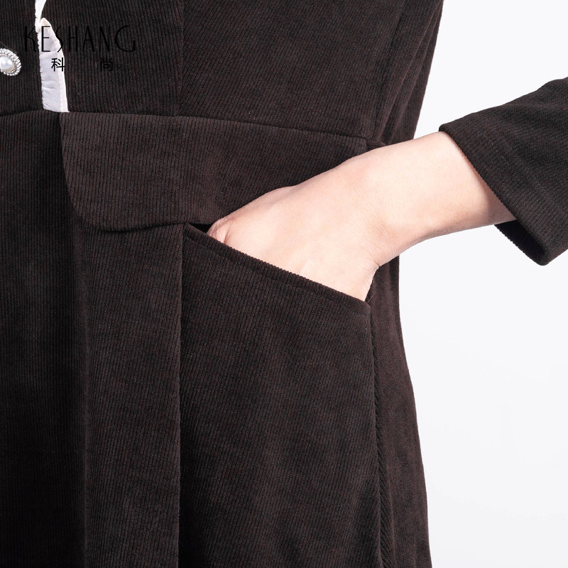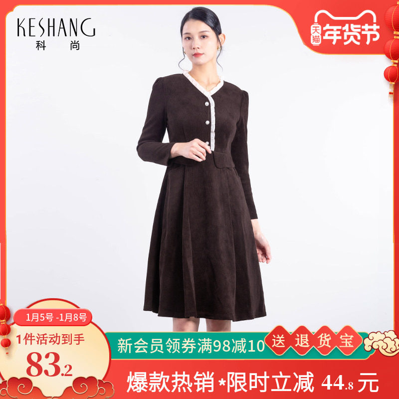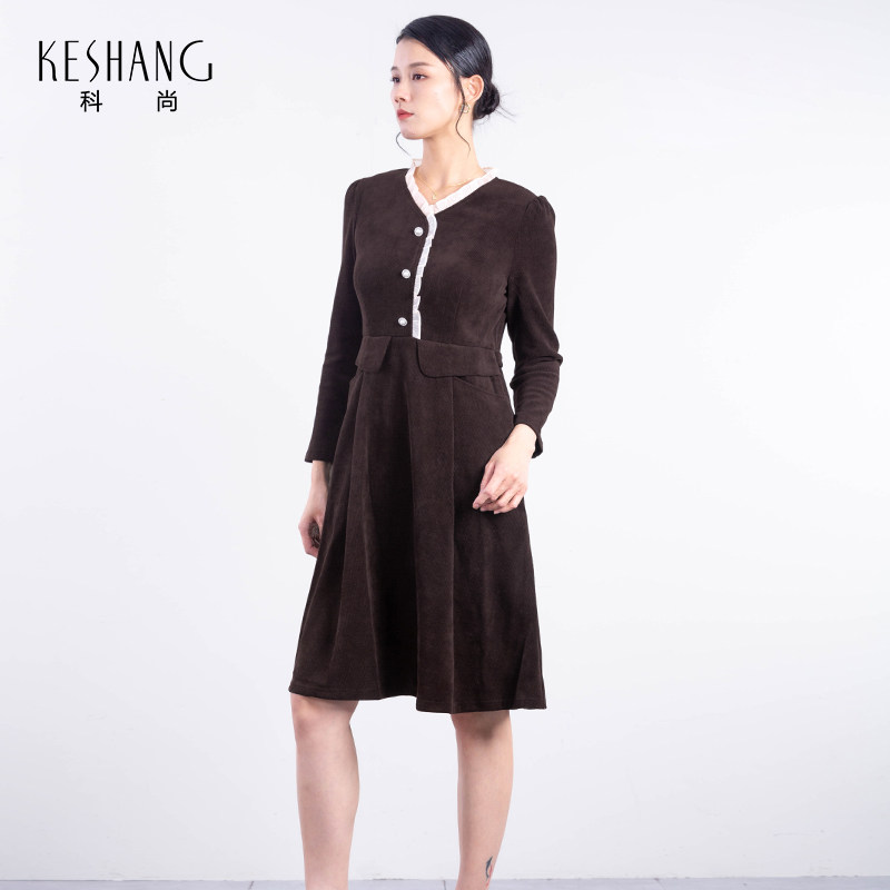 科尚中长款连衣裙女2026春季新款坑条纹裙子花边领收腰显瘦长裙