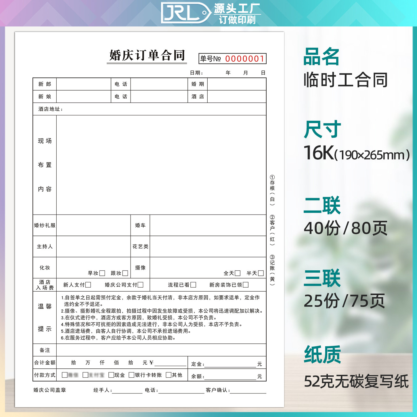 易复得婚庆订单合同二联婚礼布置摄像服务单三联结婚策划协议单据