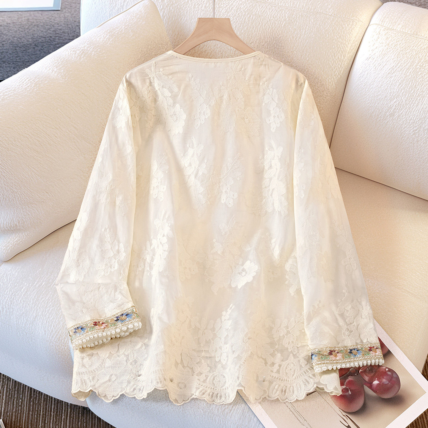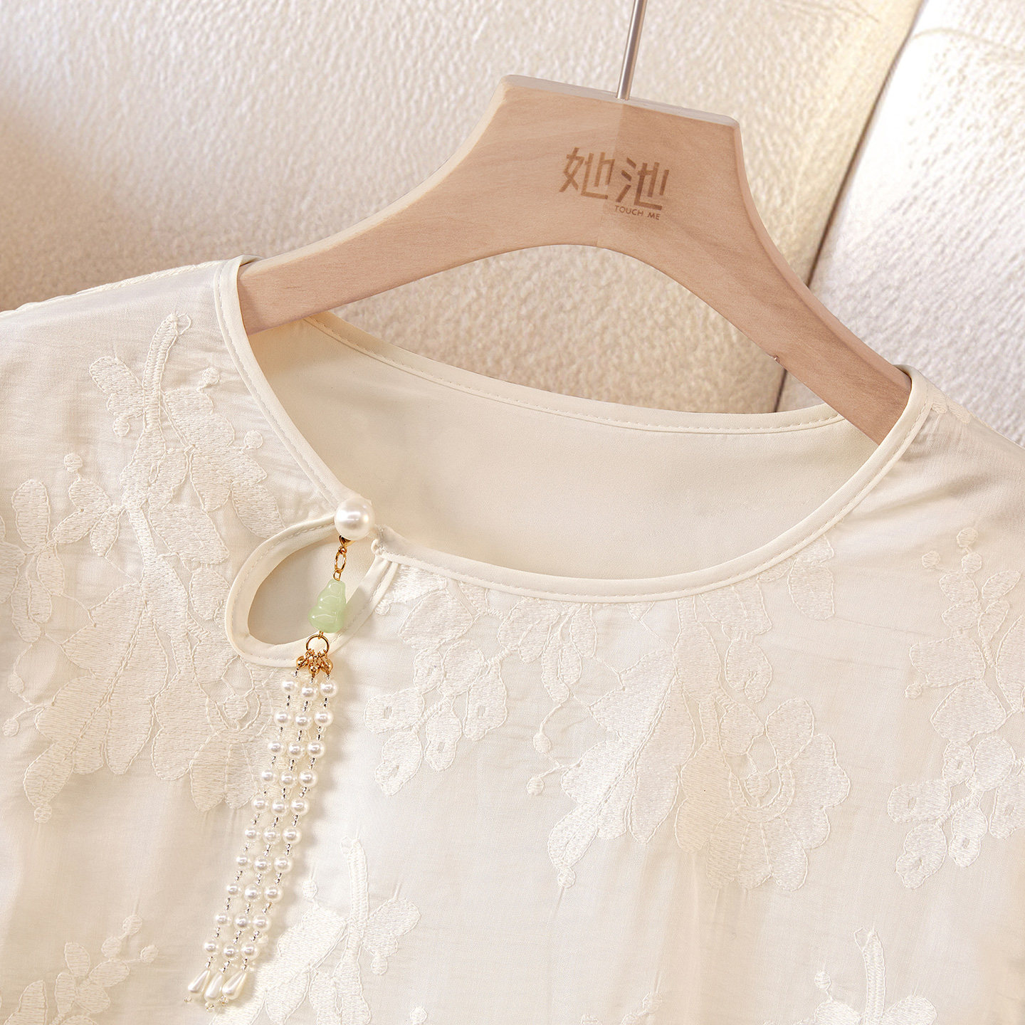 她池圆领衬衫2026春装新款女装中长款新中式宽松款刺绣蕾丝衬衣