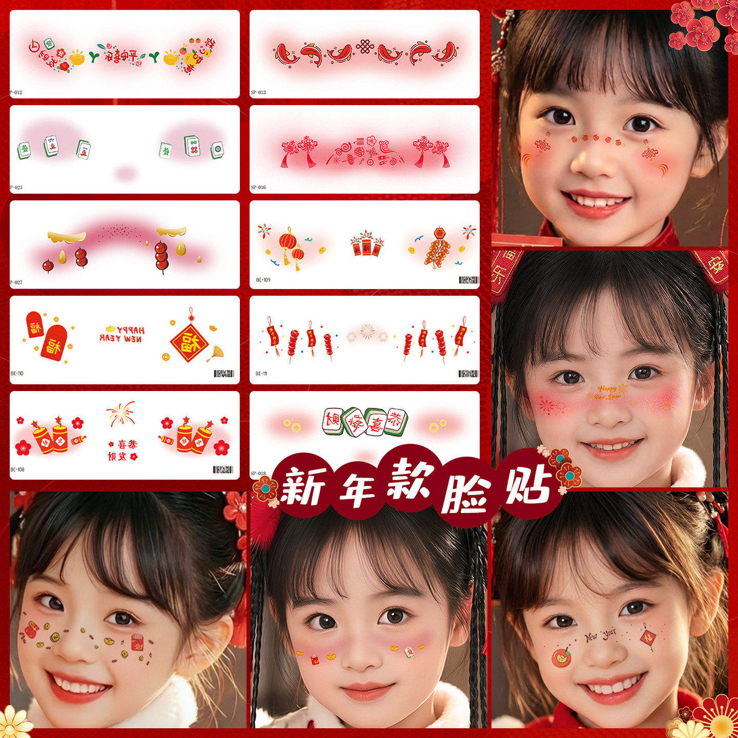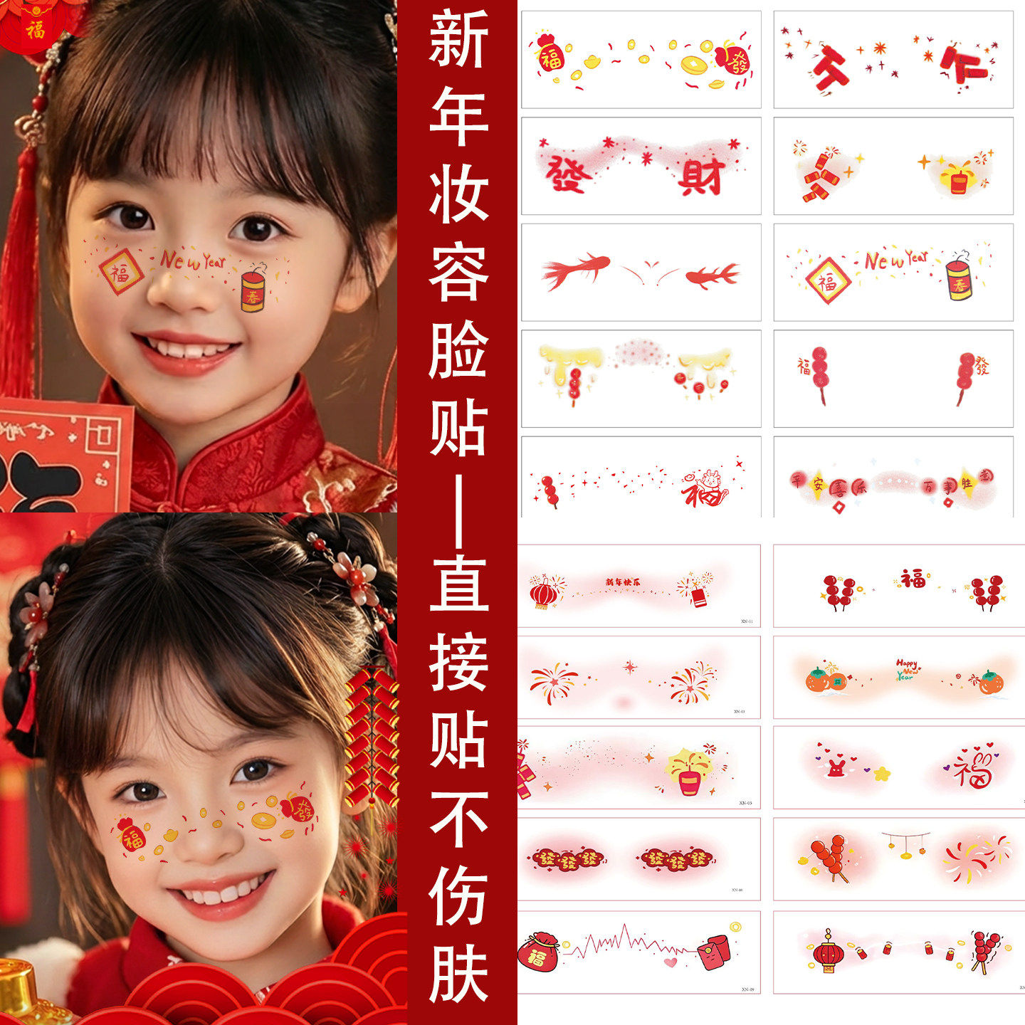 新年妆容贴脸上贴喜庆过年红色烟花爆竹氛围贴纸成人女童可爱妆容COS活动派对拍照道具腮红化妆贴防水可洗贴