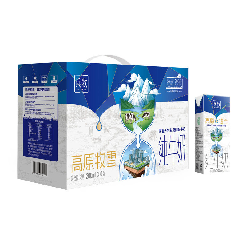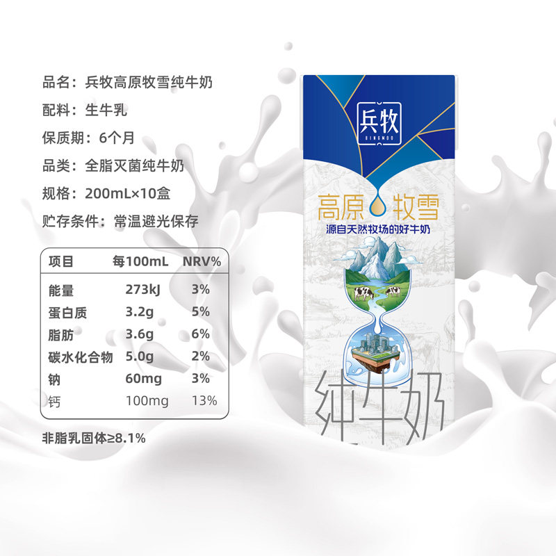 兵牧高原牧雪纯牛奶200mL盒装整箱全脂生牛乳儿童学生雪线早餐