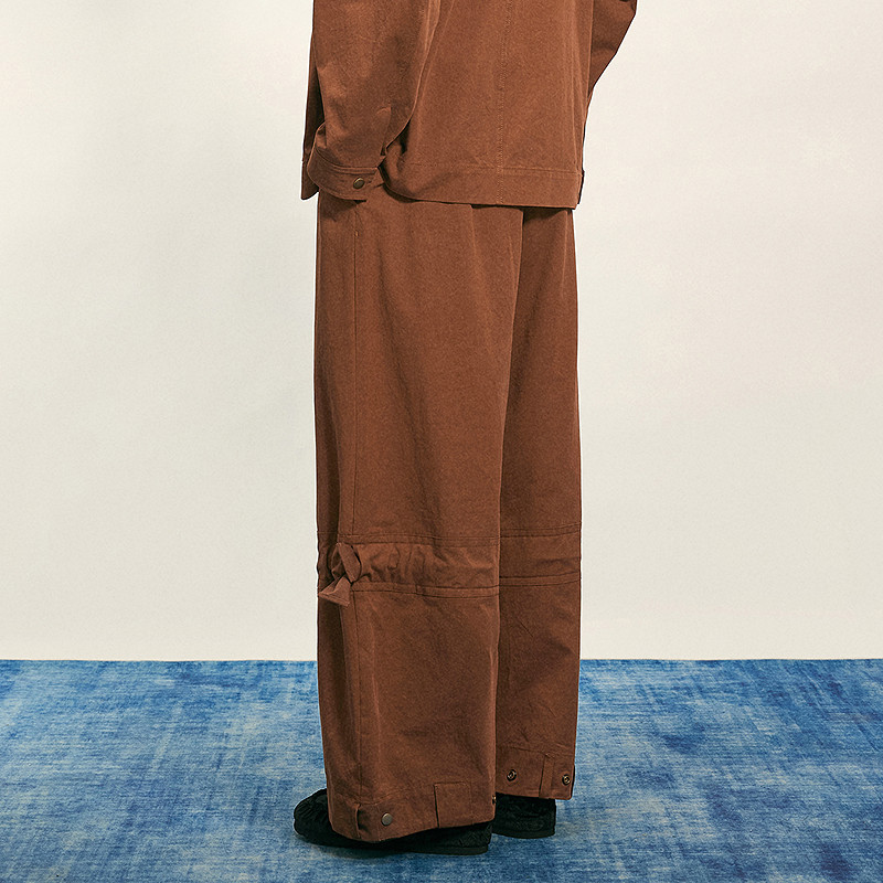 棉盐缩硬挺斜纹布,腰头裤腿处长条带设计
