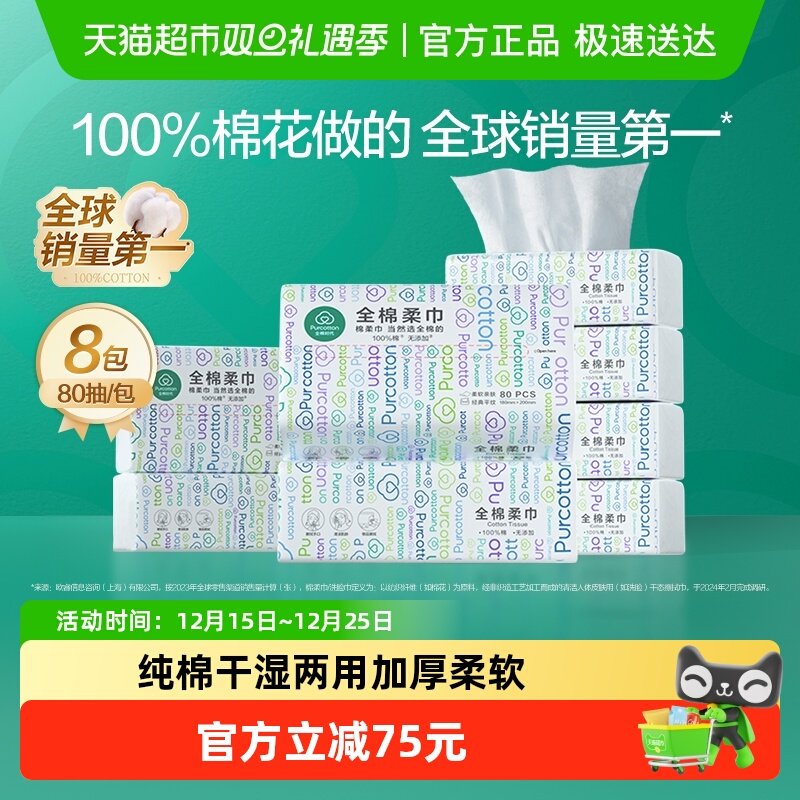 全棉时代洗脸巾纯棉柔巾洁面巾抽取式干湿两用美容擦脸巾80抽8包