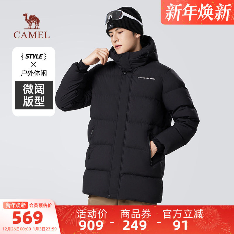 骆驼男装中长款羽绒服男款黑色秋冬户外防风加厚保暖拒水工装外套