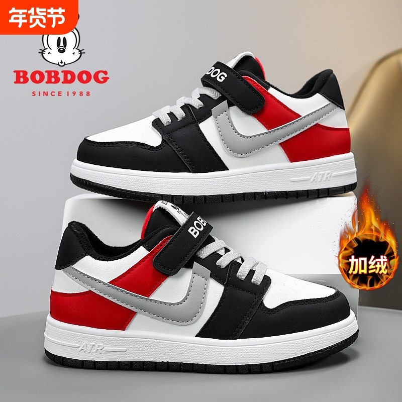 巴布豆男童运动鞋加绒保暖二棉鞋男孩AJ儿童鞋子皮面冬季高帮红色