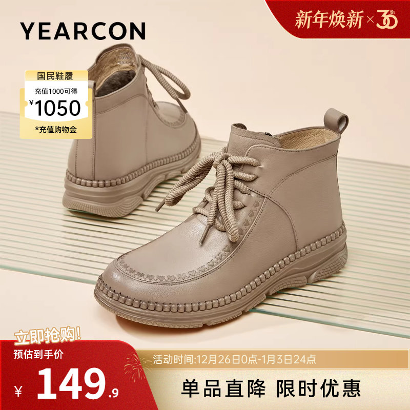 意尔康女鞋冬季靴子短靴真皮短筒皮靴中老年妈妈棉鞋加绒保暖皮鞋