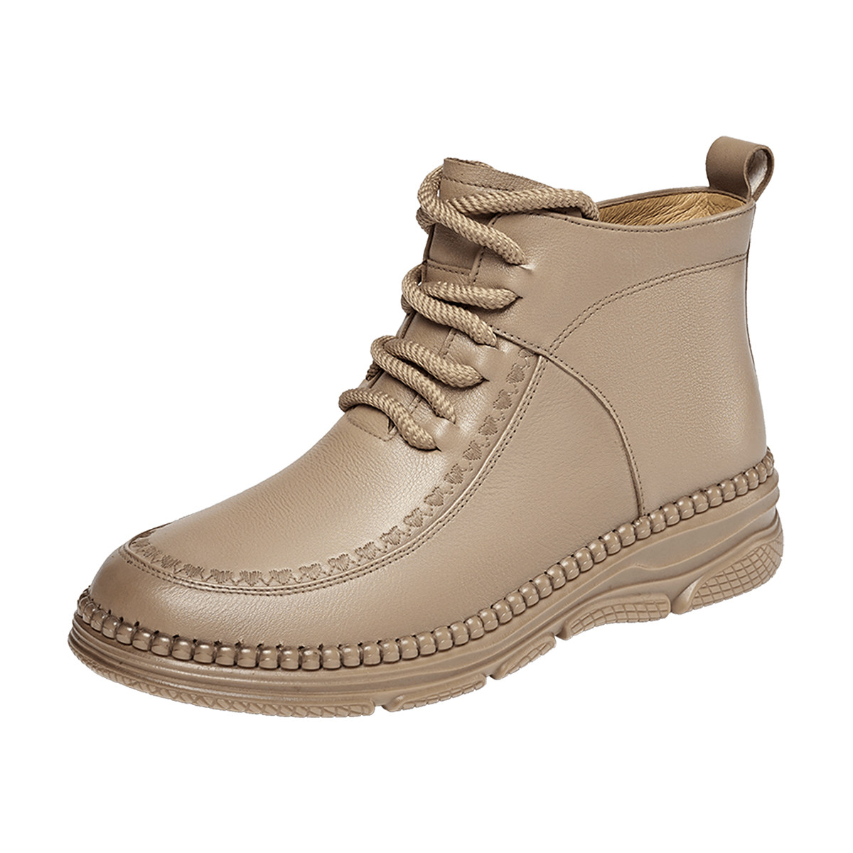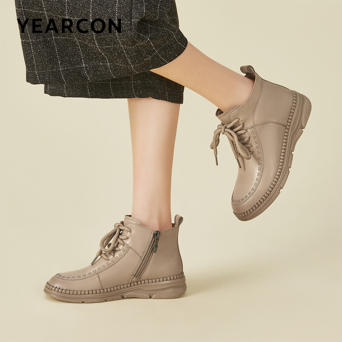 羊皮版~内增高靴子女2025新款爆款中筒粗跟短靴卡其色褶皱堆堆靴
