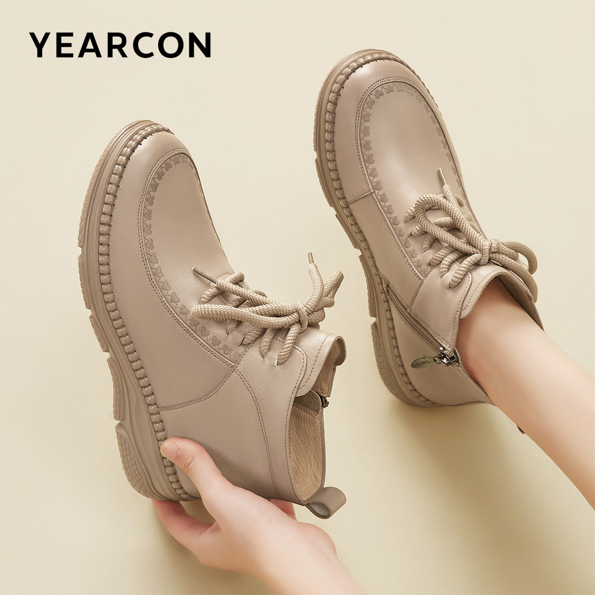 牛皮~骄屿复古圆头雪地靴加绒保暖毛毛棉靴两穿平底棕色勃肯短靴