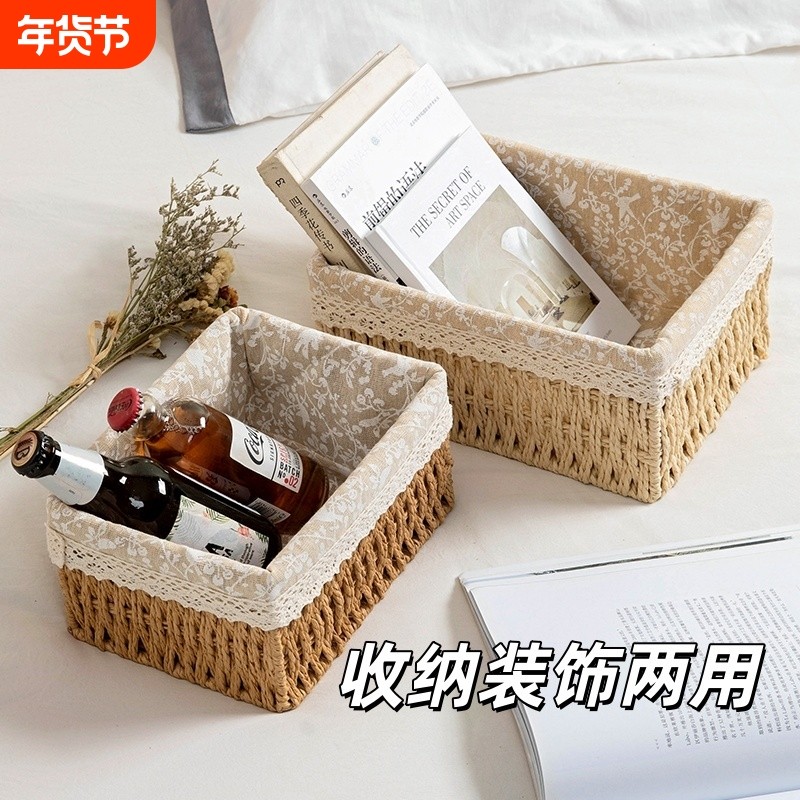 桌面收纳盒化妆品钥匙零食茶几杂物整理盒储物藤编筐编织框子家居