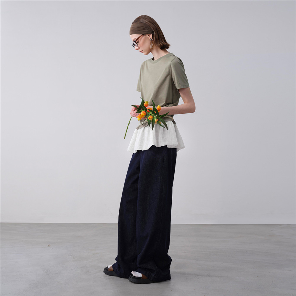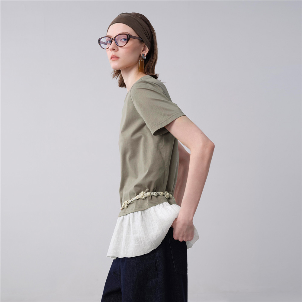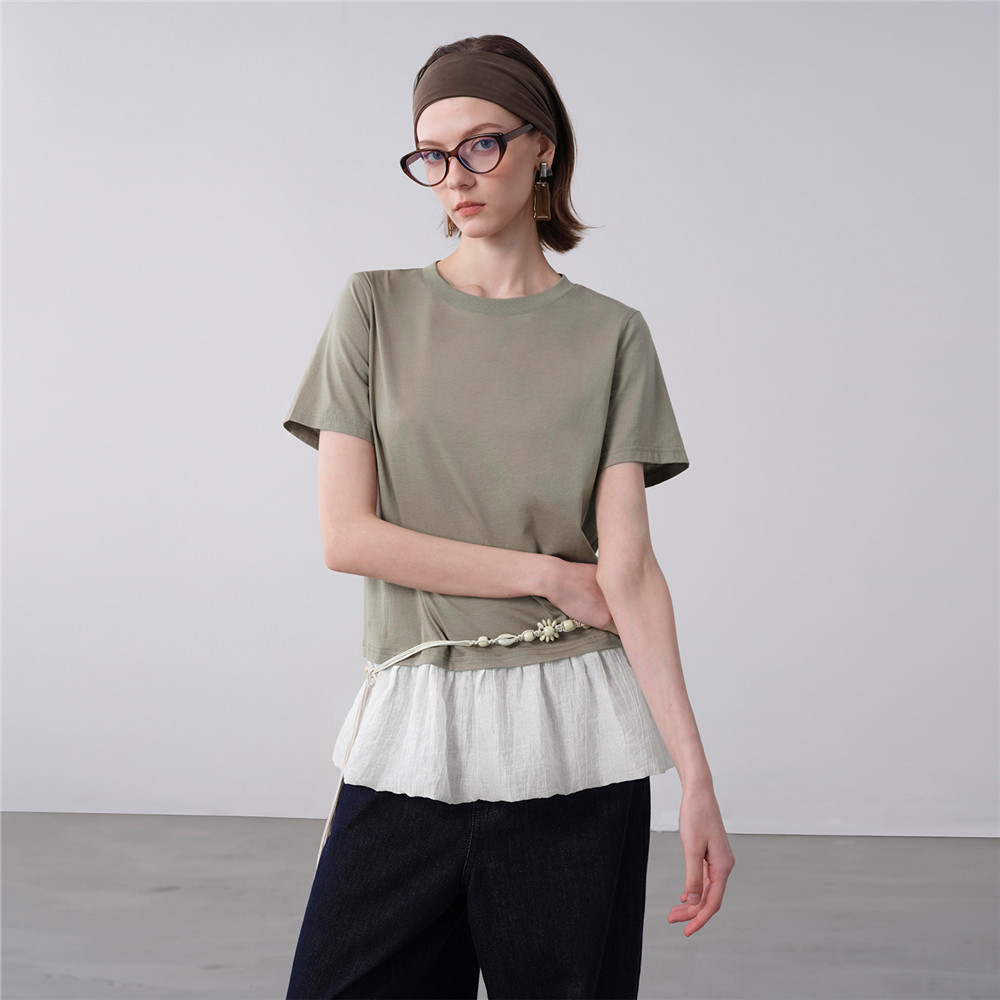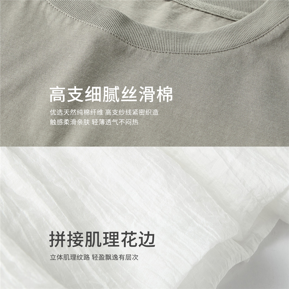 设计师款佐丹奴短袖T恤女夏季拼接泡泡花边宽松圆领上衣18325914