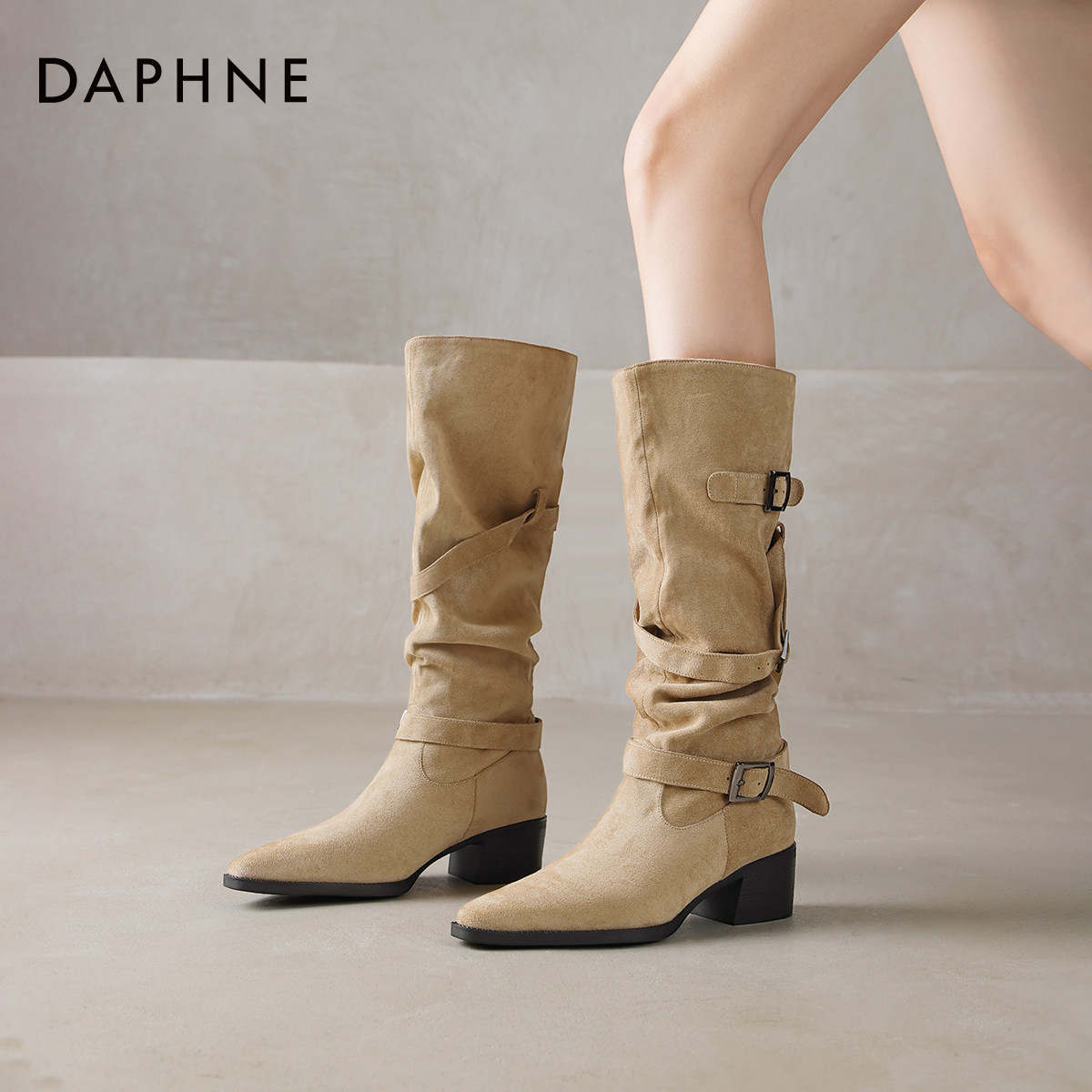 达芙妮靴子女款2026新款春季长筒靴美拉德高跟尖头高筒骑士堆堆靴