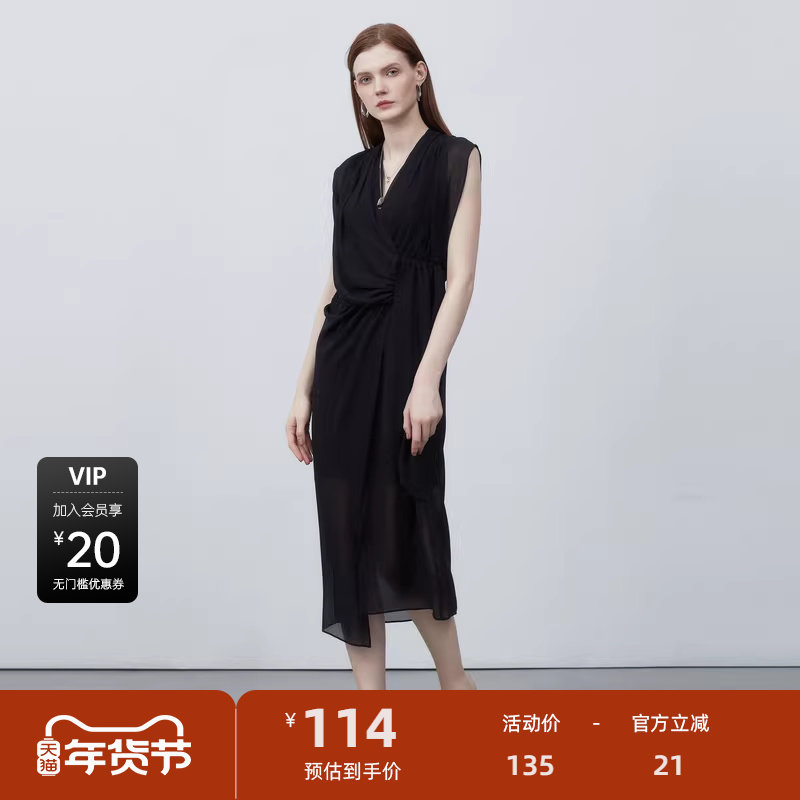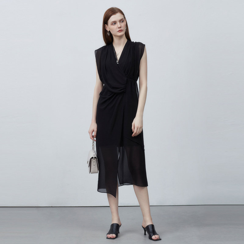 sdeer圣迪奥V领系带不规则拼接无袖连衣裙S223Z12G6