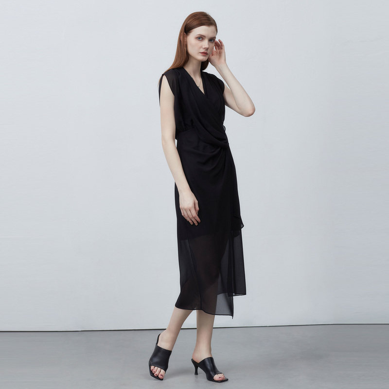 V领连衣裙 压褶拼接 雪纺质地