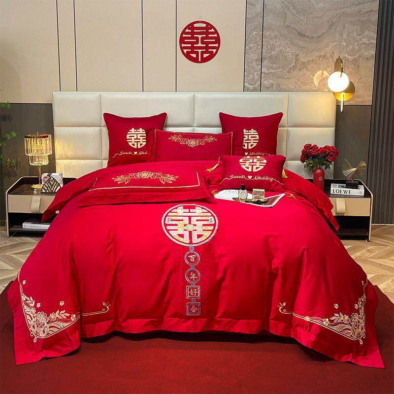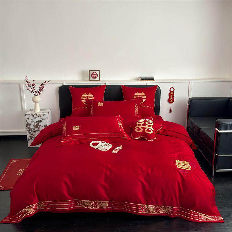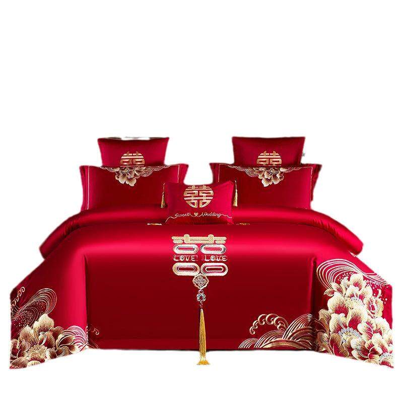 婚庆四件套大红色刺绣新婚喜被套件纯棉婚房绣花结婚床上用品全棉