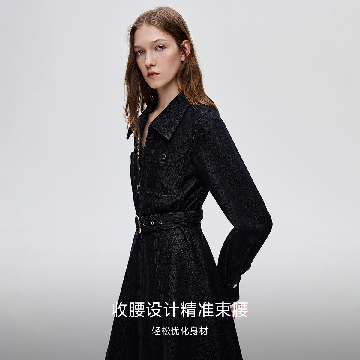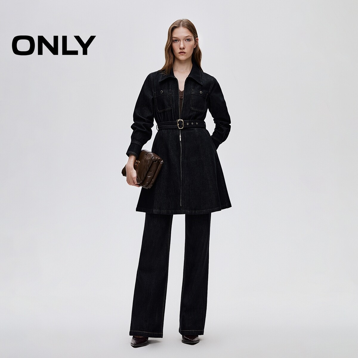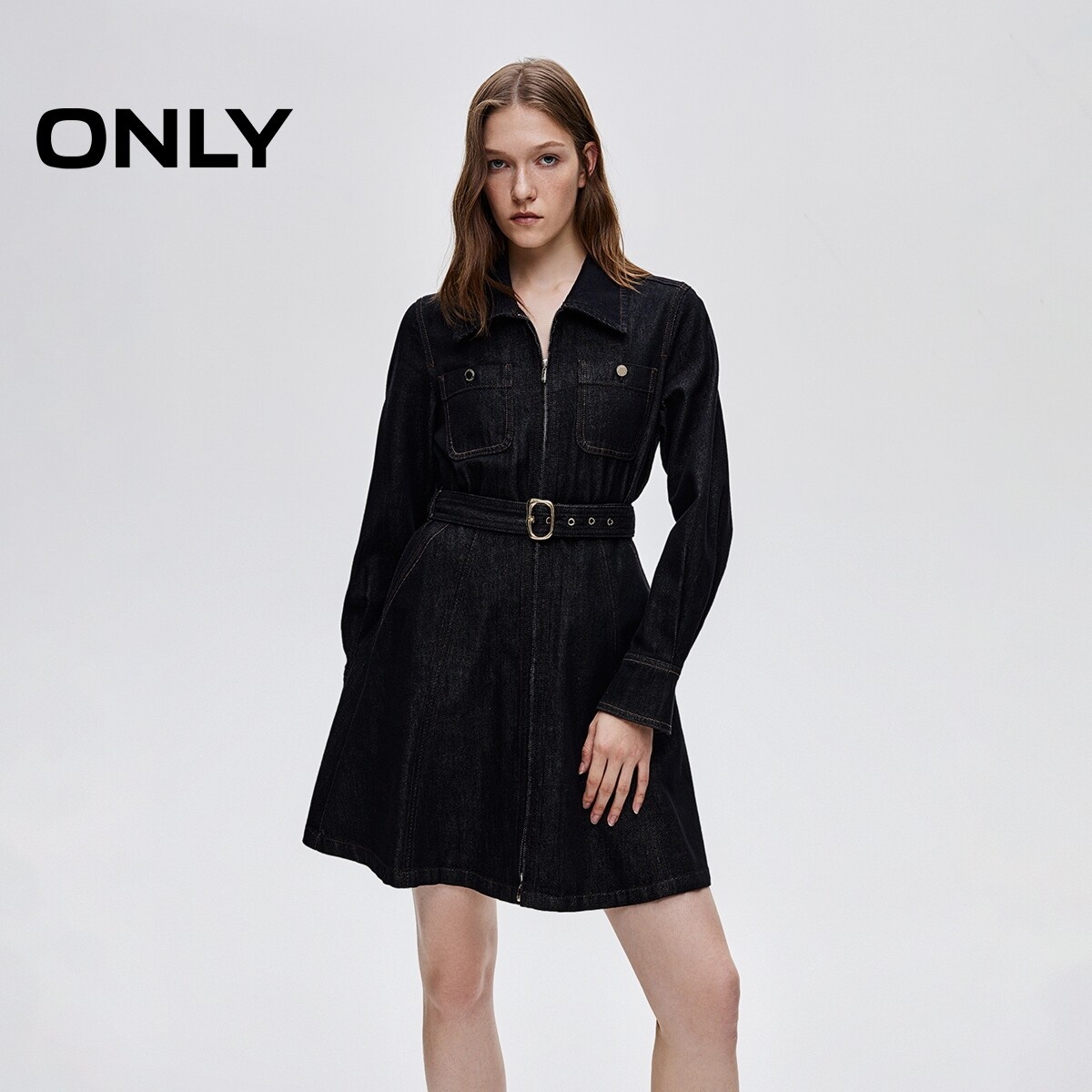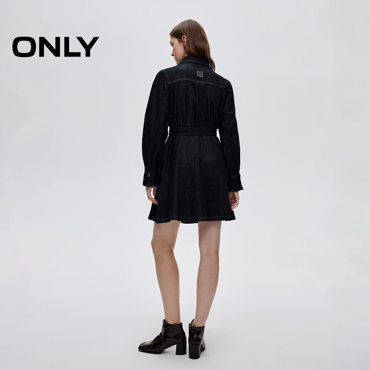ONLY2026春季新款通勤复古水洗腰带收腰翻领短裙牛仔连衣裙女