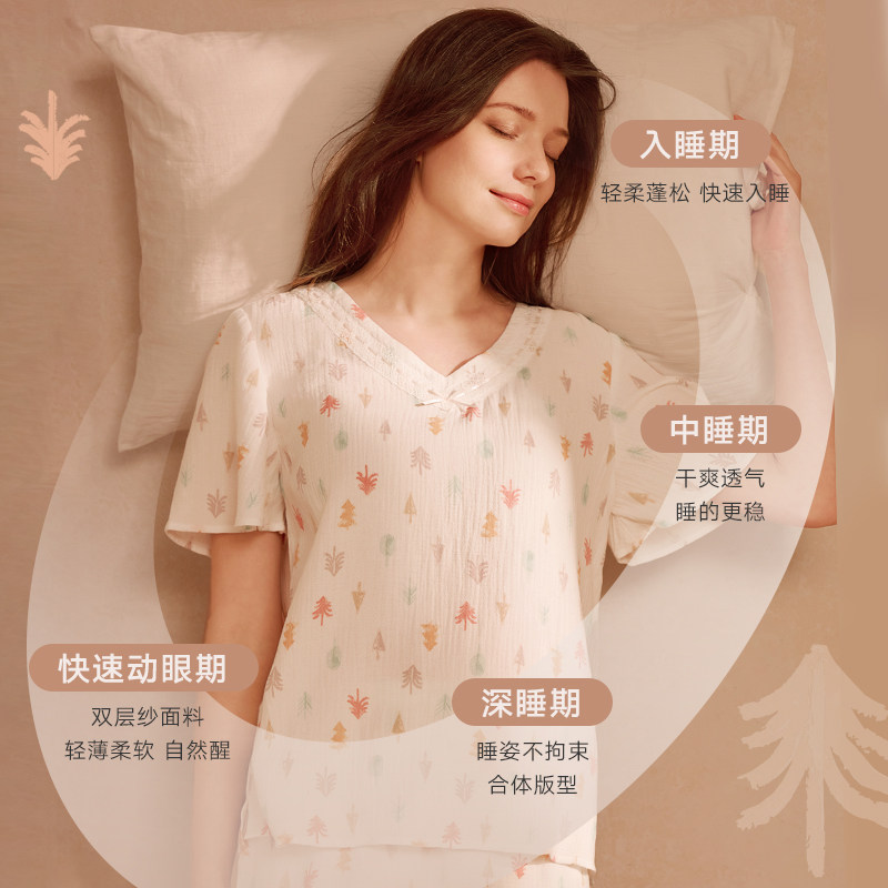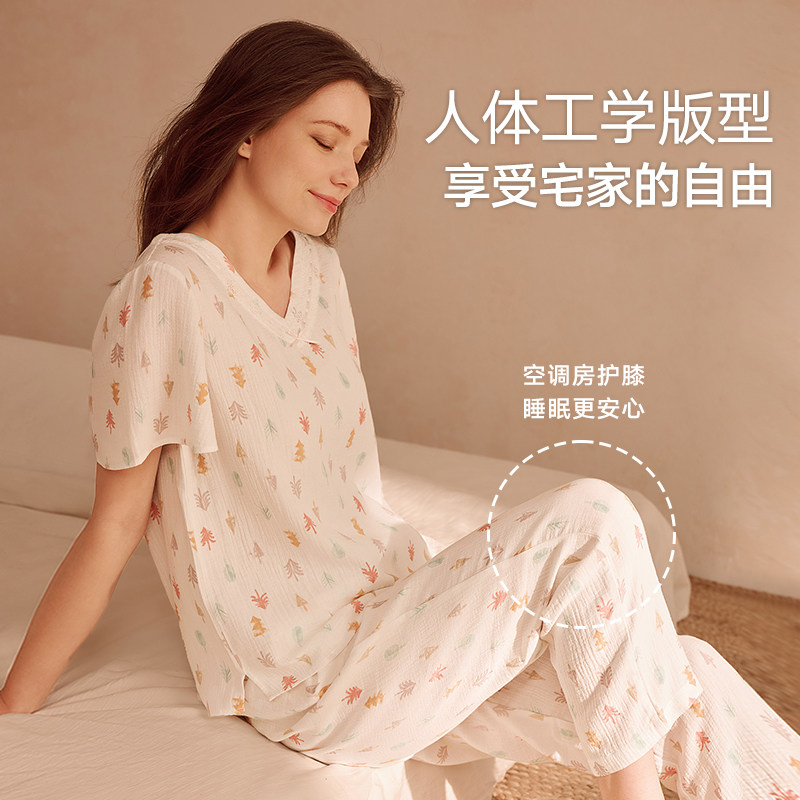 曼妮芬印花舒适家居服可外穿套装睡衣棉质套头女生起居服20312043