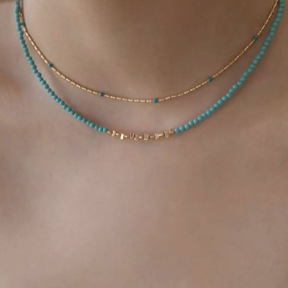 绿松石小米珠项链细小串珠锁骨链搭配碎金字银国风简约大气