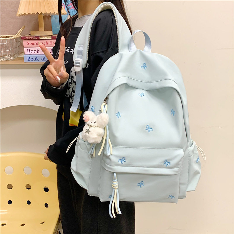 稻草人简约百搭双肩包大学生中学生可爱刺绣蝴蝶结轻便出游背包
