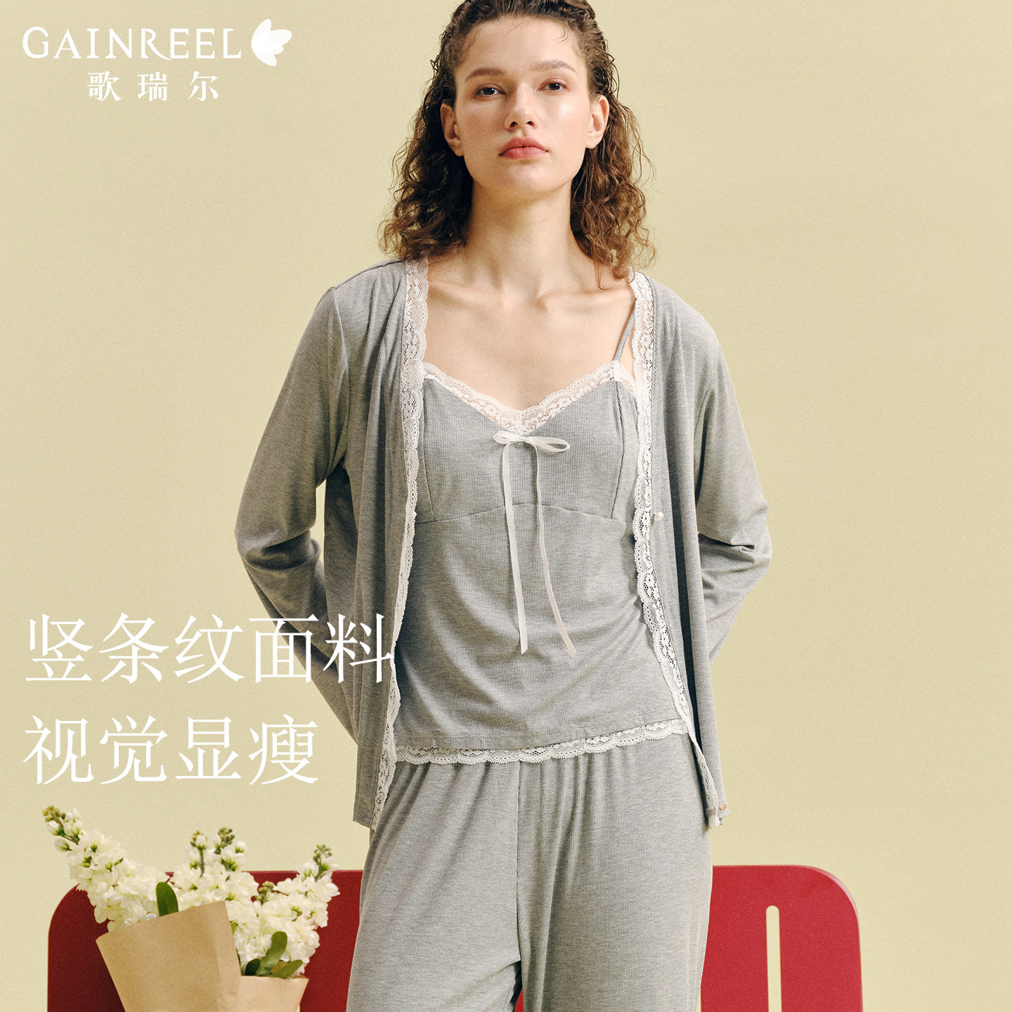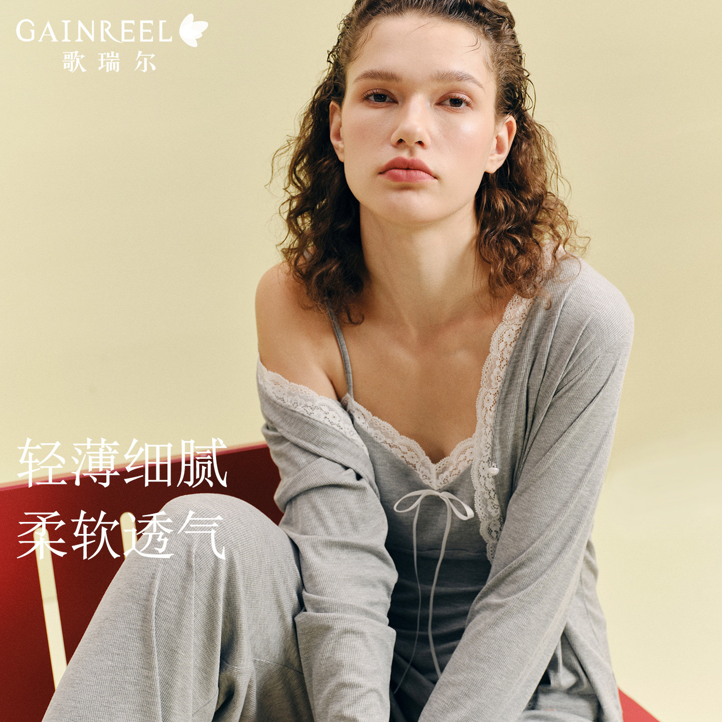 歌瑞尔百搭睡衣三件套纯欲蕾丝边吊带背心套装性感宽松女士家居服