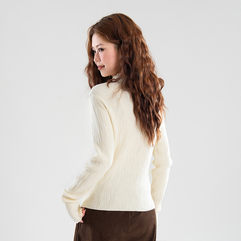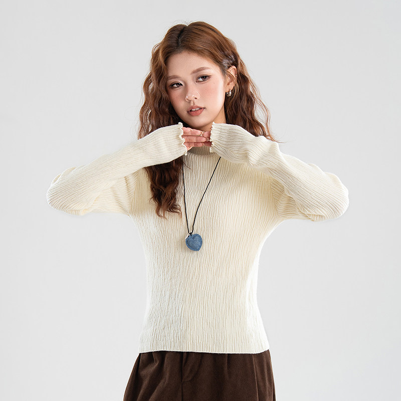 热风女士简约优雅气质半高领木耳边针织衫秋冬女时尚减龄休闲打底