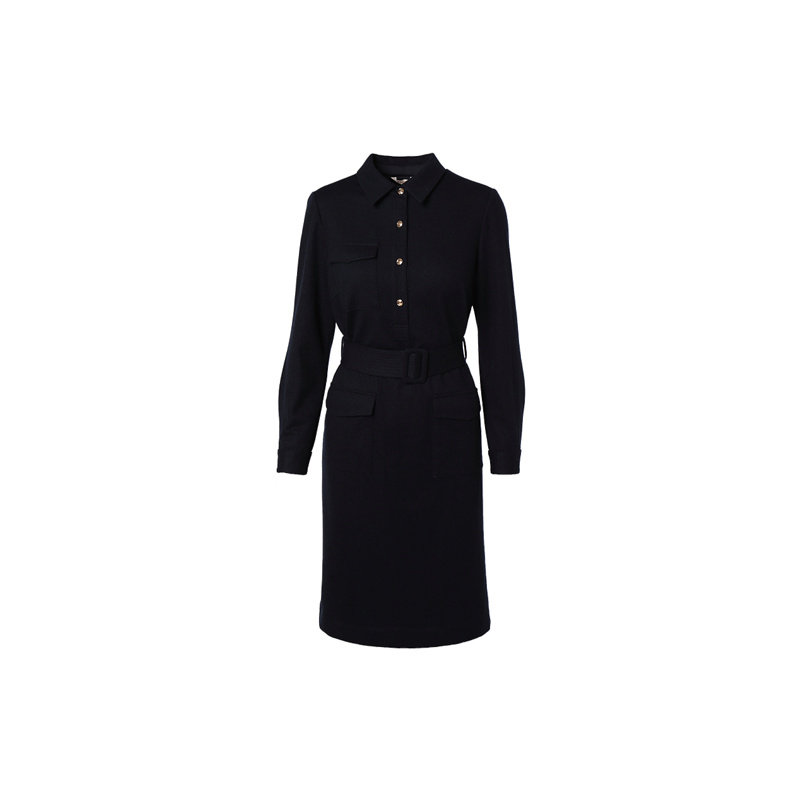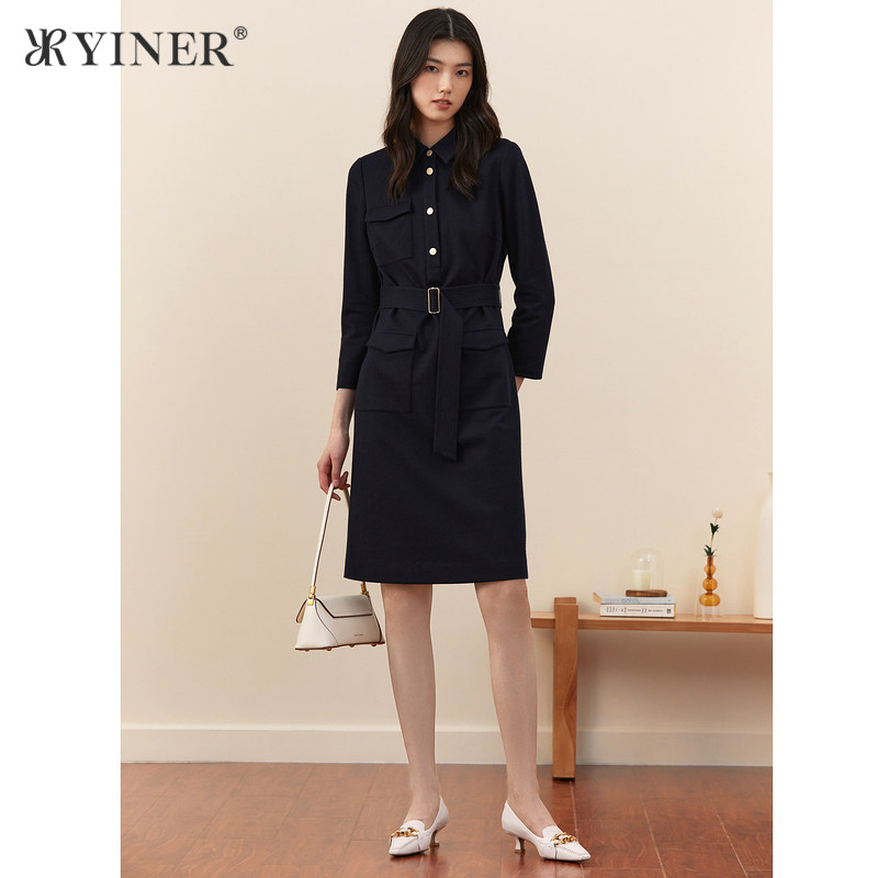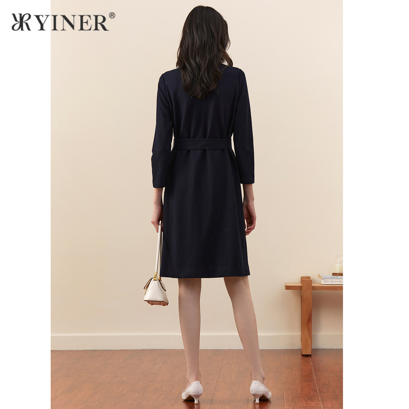 YINER音儿女装冬季衬衫领系带羊毛呢连衣裙