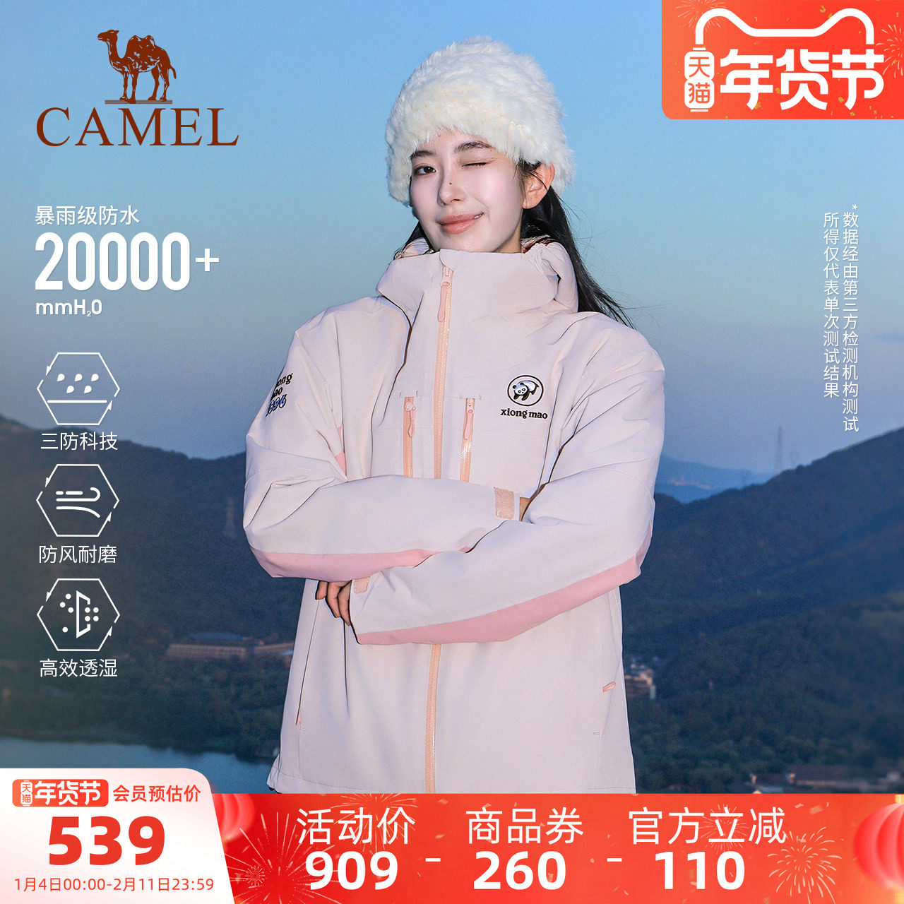 骆驼熊猫粉色三合一冲锋衣女款新款冬季户外防风登山服加厚外套男