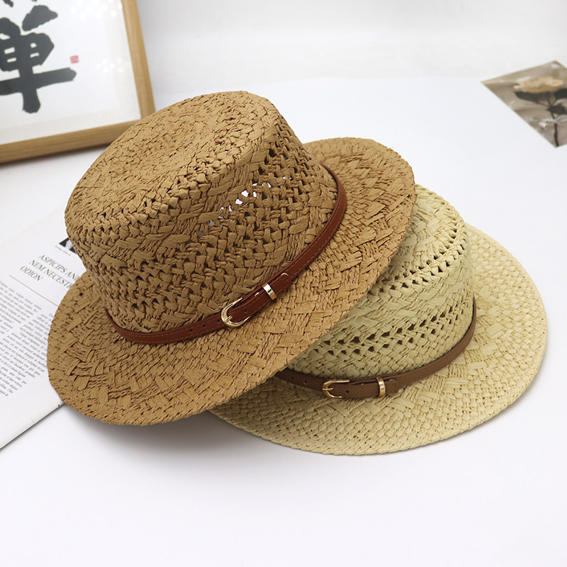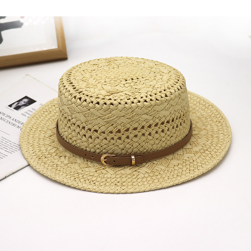 英伦风复古平顶草帽女夏季镂空遮阳防晒帽海边度假风草编太阳帽子