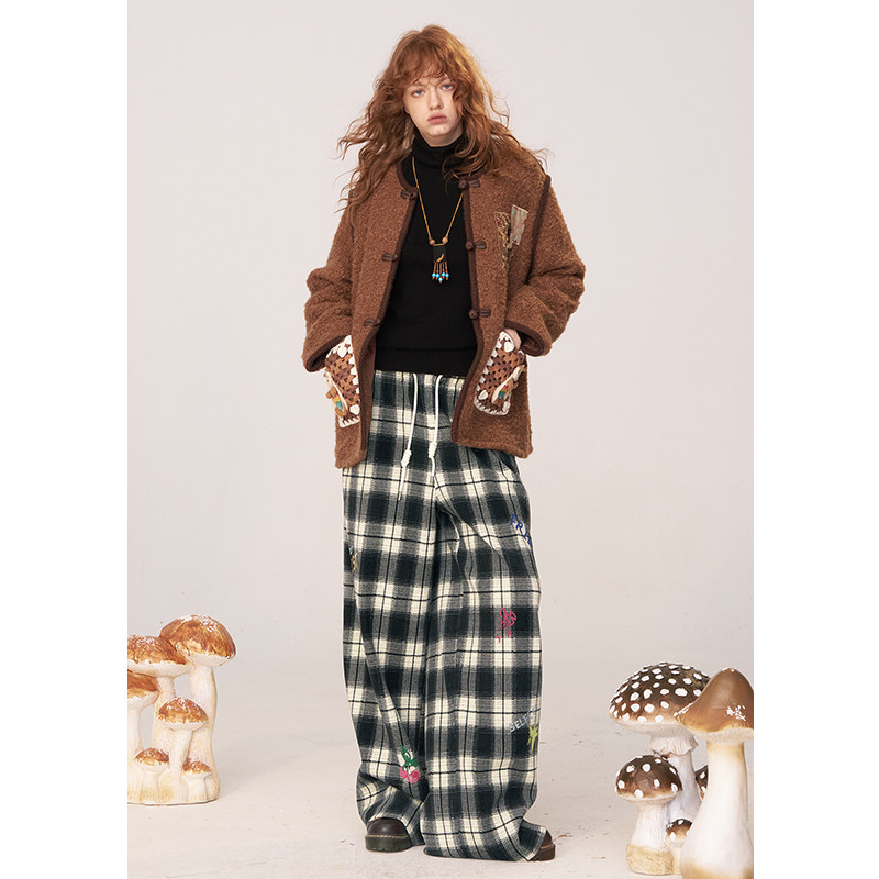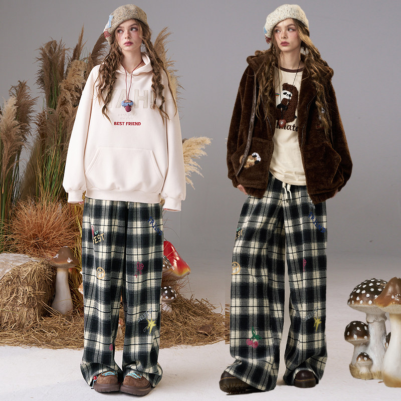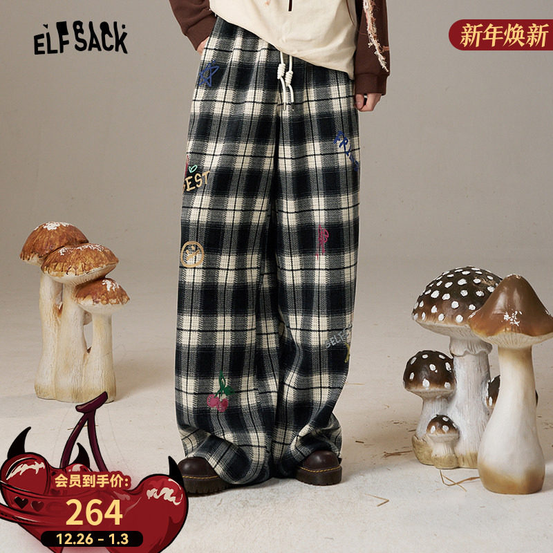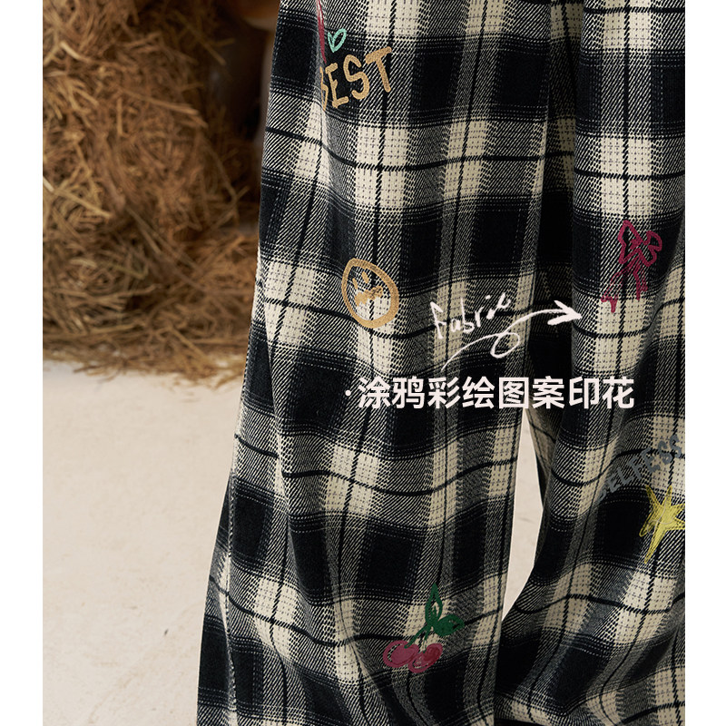 妖精的口袋涂鸦格子休闲裤女2025年秋冬新款慵懒风宽松阔腿裤子