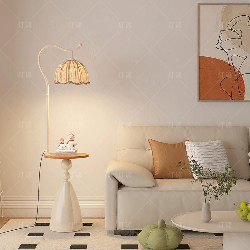 奶油风置物架一体落地灯客厅沙发旁边几摆件氛围灯卧室床头柜台灯