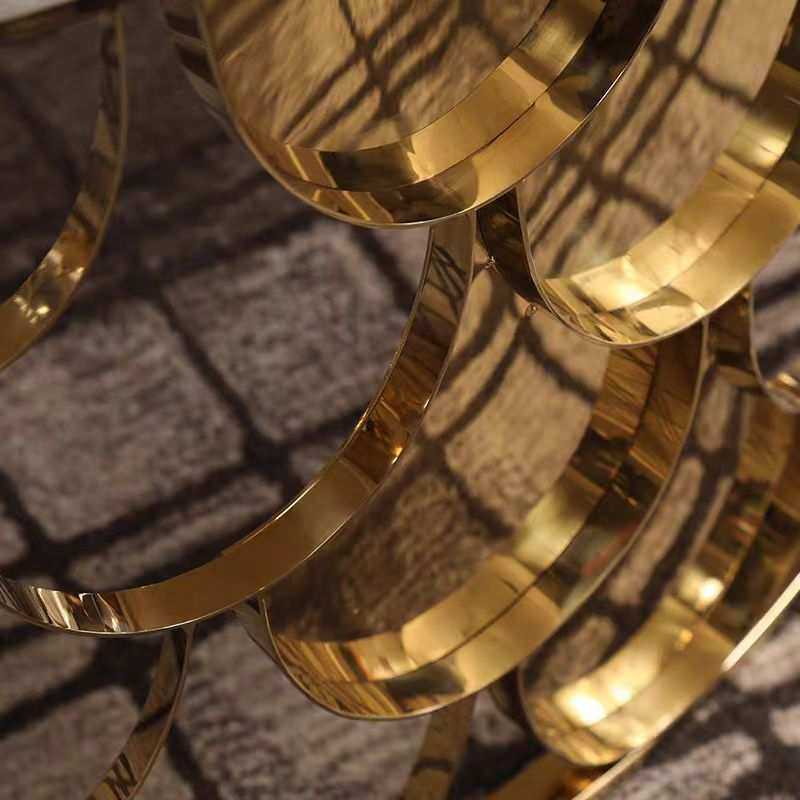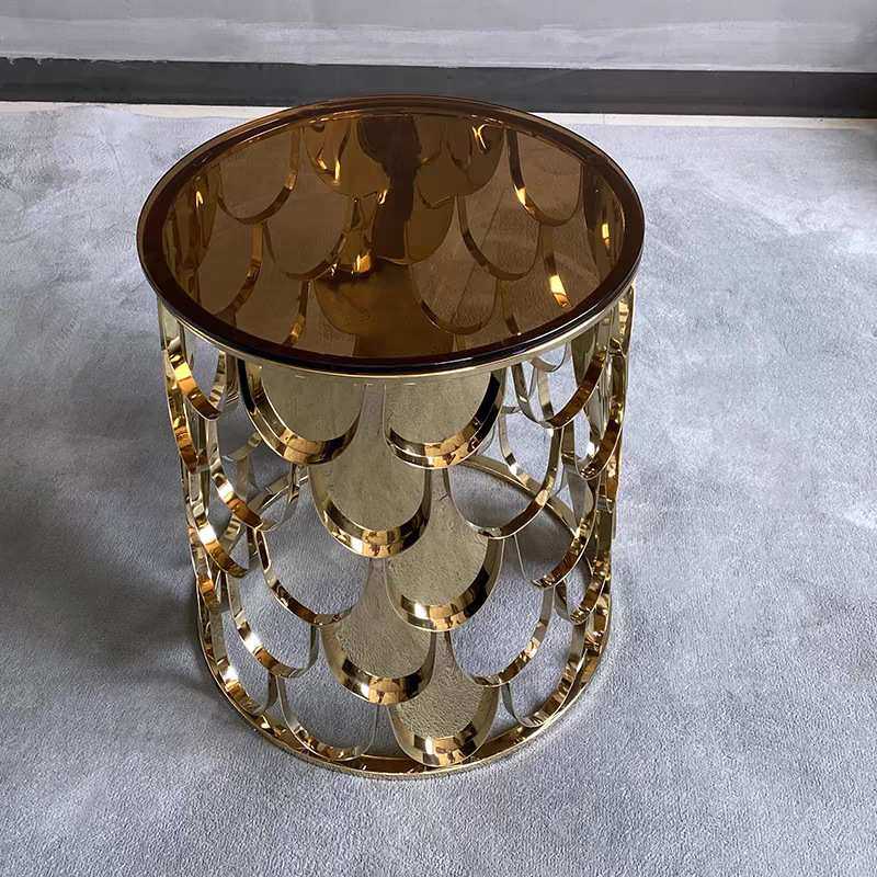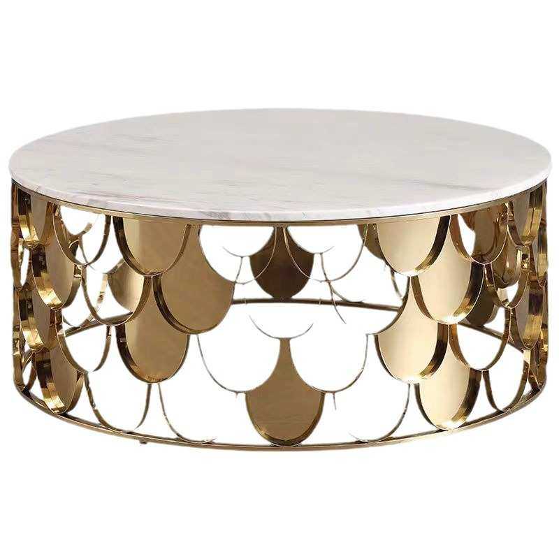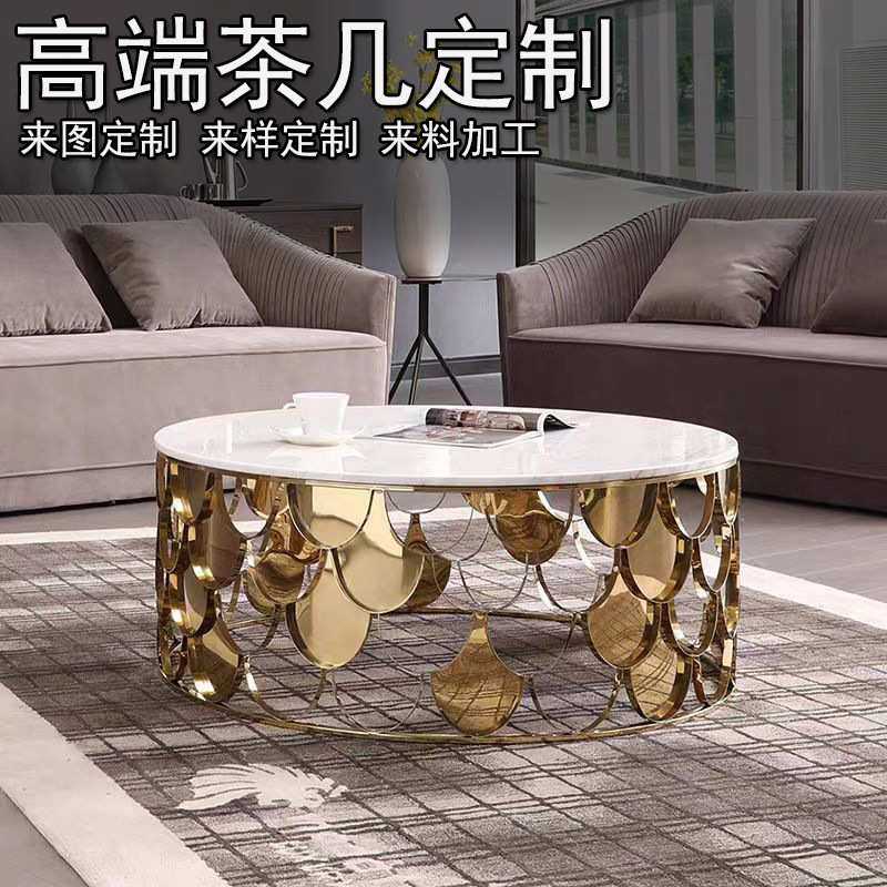 意式高端茶几轻奢客厅圆形天然大理石不锈钢鱼鳞镂空美式玻璃桌