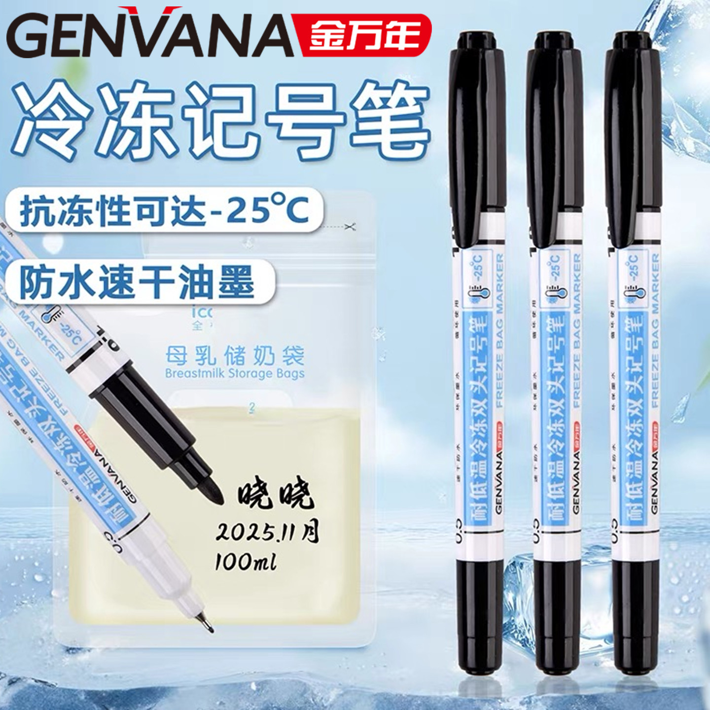 金万年耐低温冷冻记号笔储奶袋专用标记笔实验室小双头低温防水耐光防冻冰箱冷冻冷餐食品包装标签记号标记笔