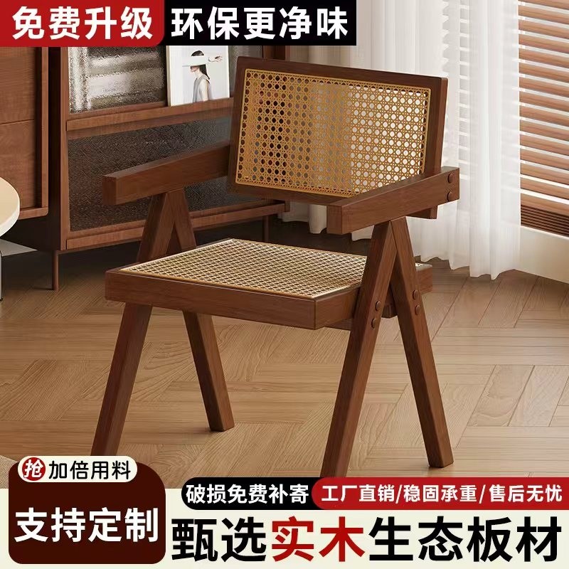 实木餐椅侘寂风昌迪加尔椅扶手中古藤编餐厅餐桌椅家居阳台原木色
