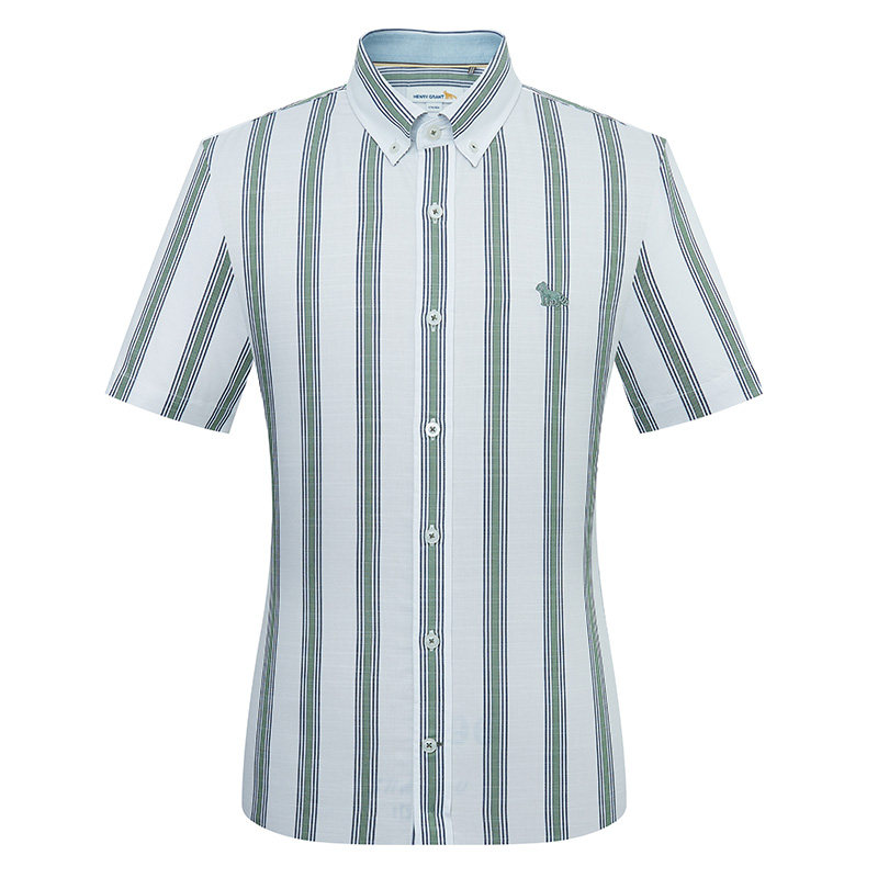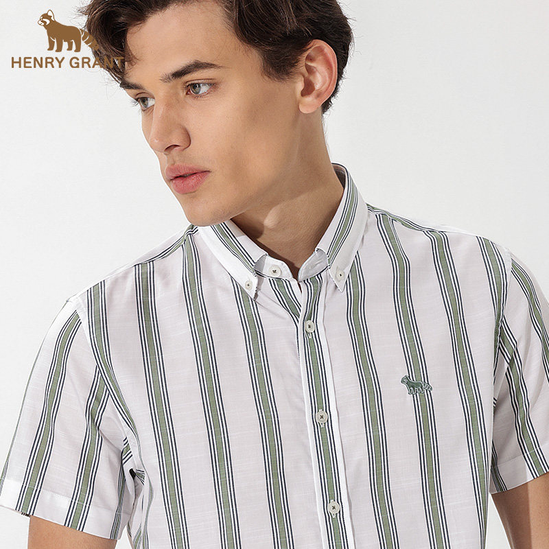 亨利格兰小熊猫男装夏季新款男商务休闲条纹翻领短袖衬衫经典衬衣