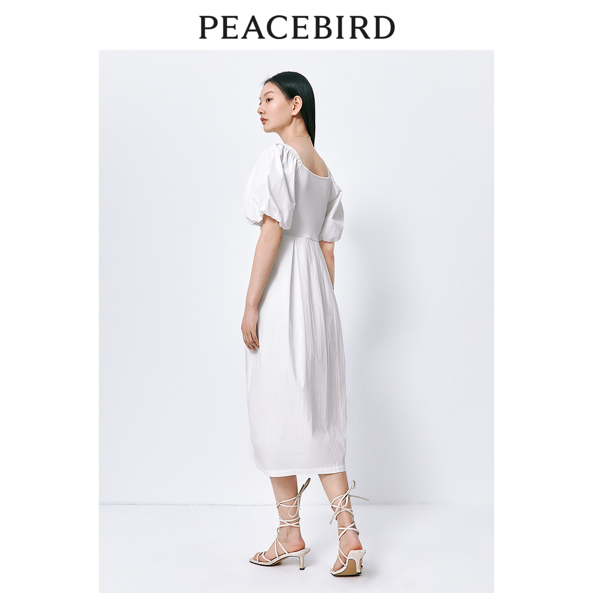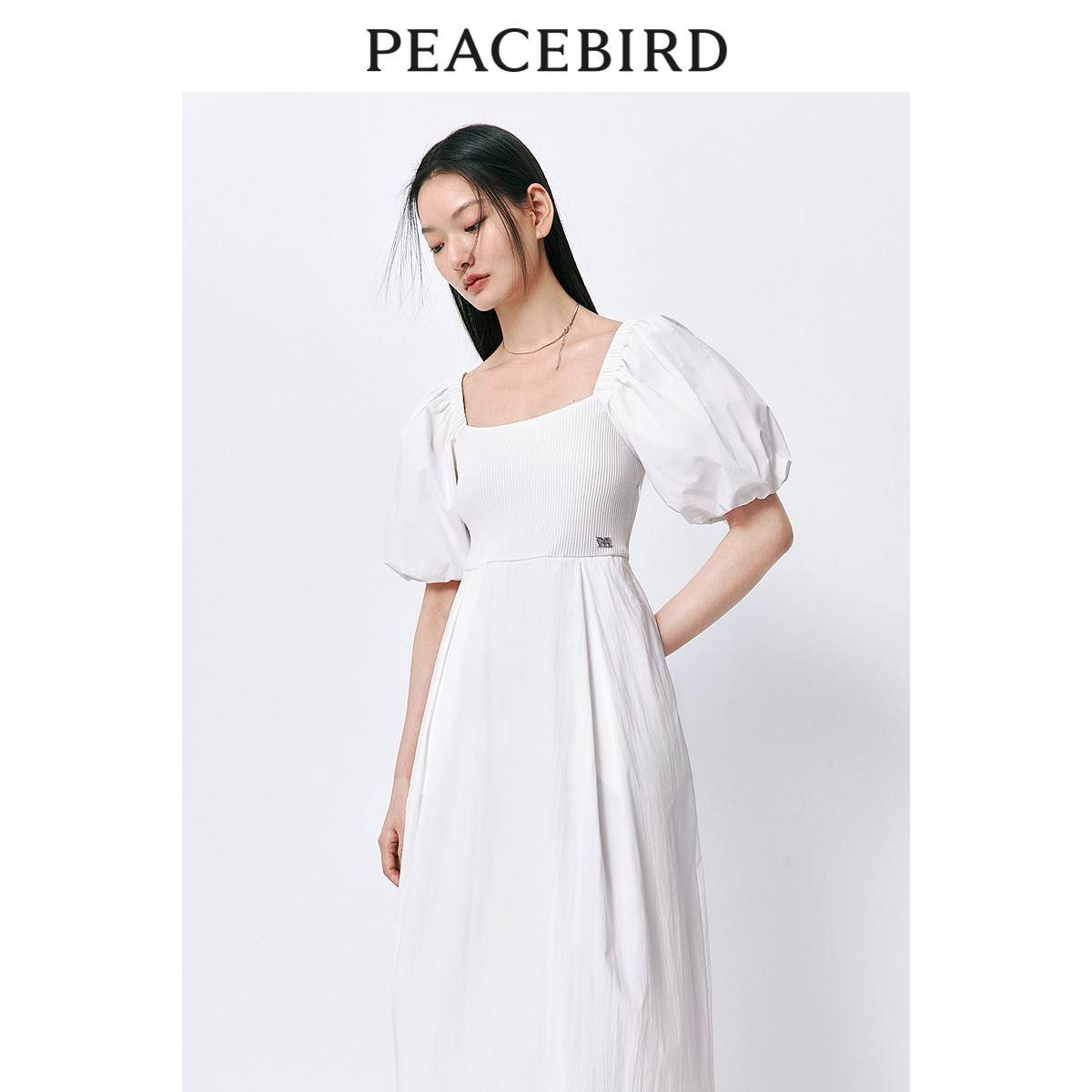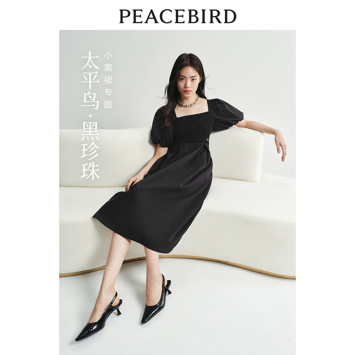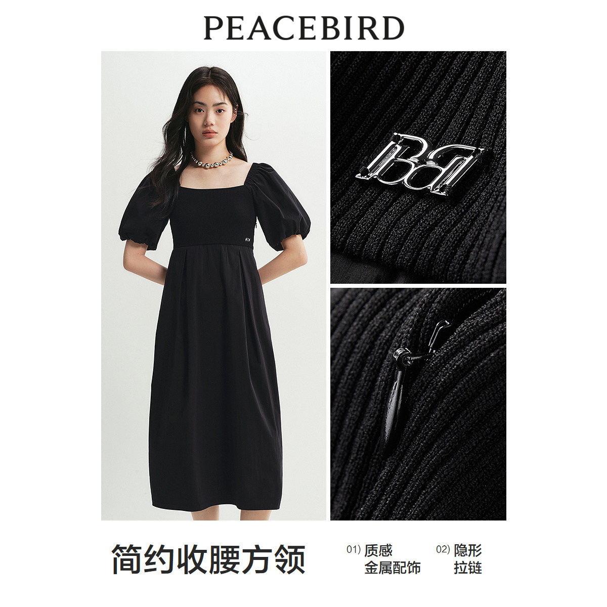 太平鸟女装黑珍珠简约方领连衣裙夏新款泡泡袖长裙拼接收腰小黑裙