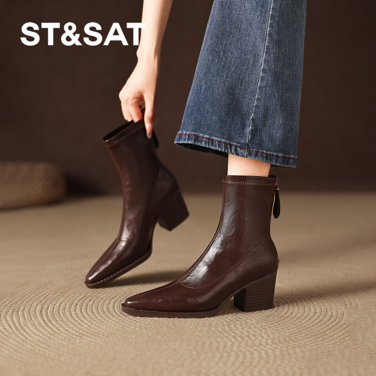 米霏!真皮~棕色方头瘦瘦靴女粗跟马丁靴切尔西高跟短靴大码女靴