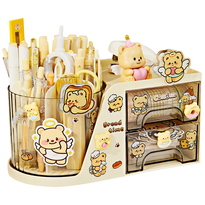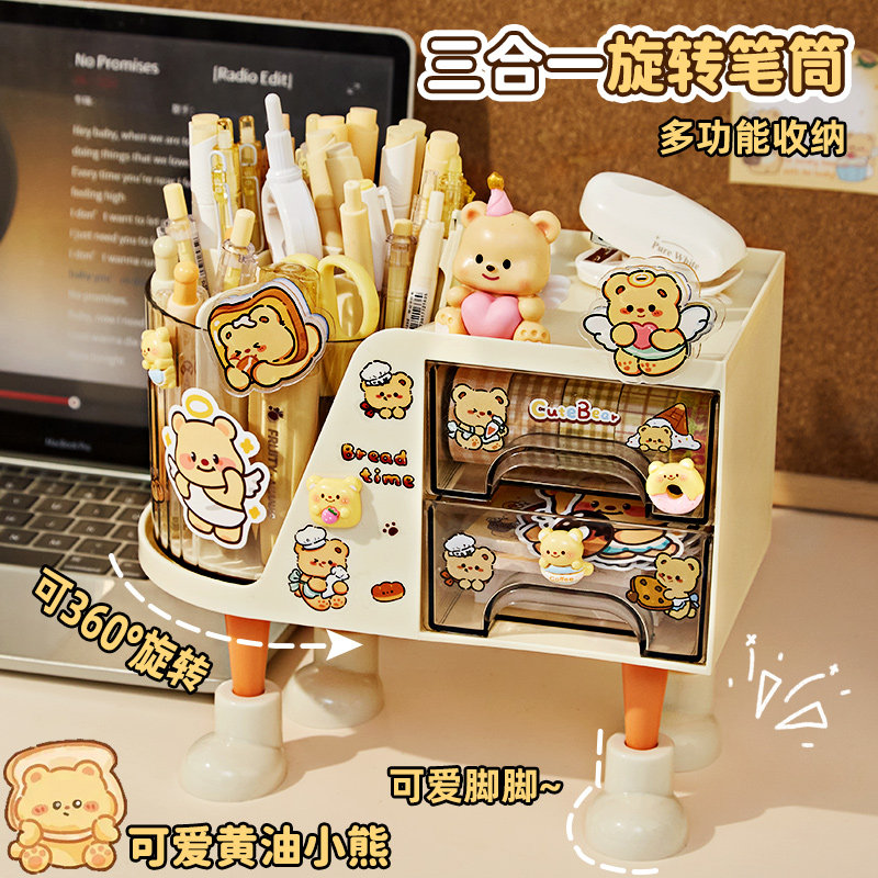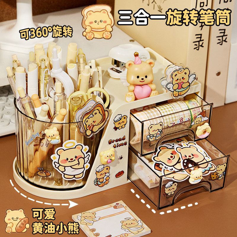奶油小熊!笔筒收纳盒女孩儿童大容量书桌笔盒女生抽屉式旋转小学生桌面高颜值ins风文具置物架女童可爱创意