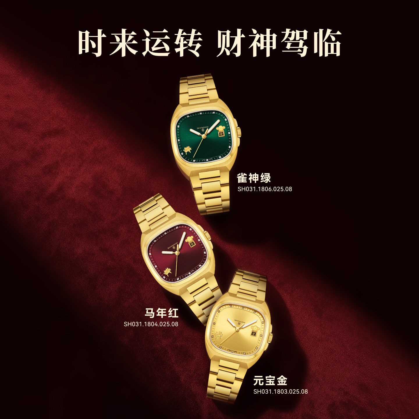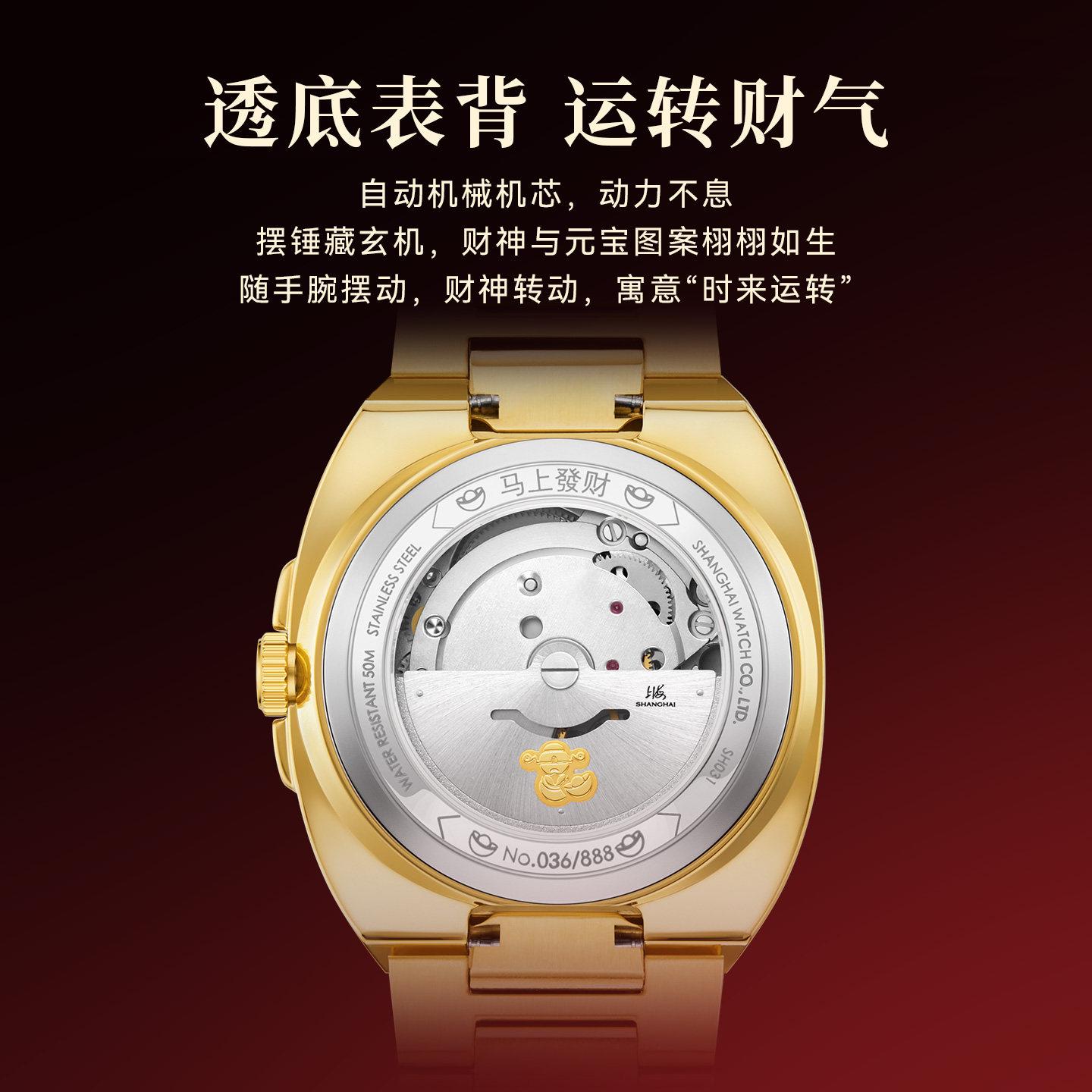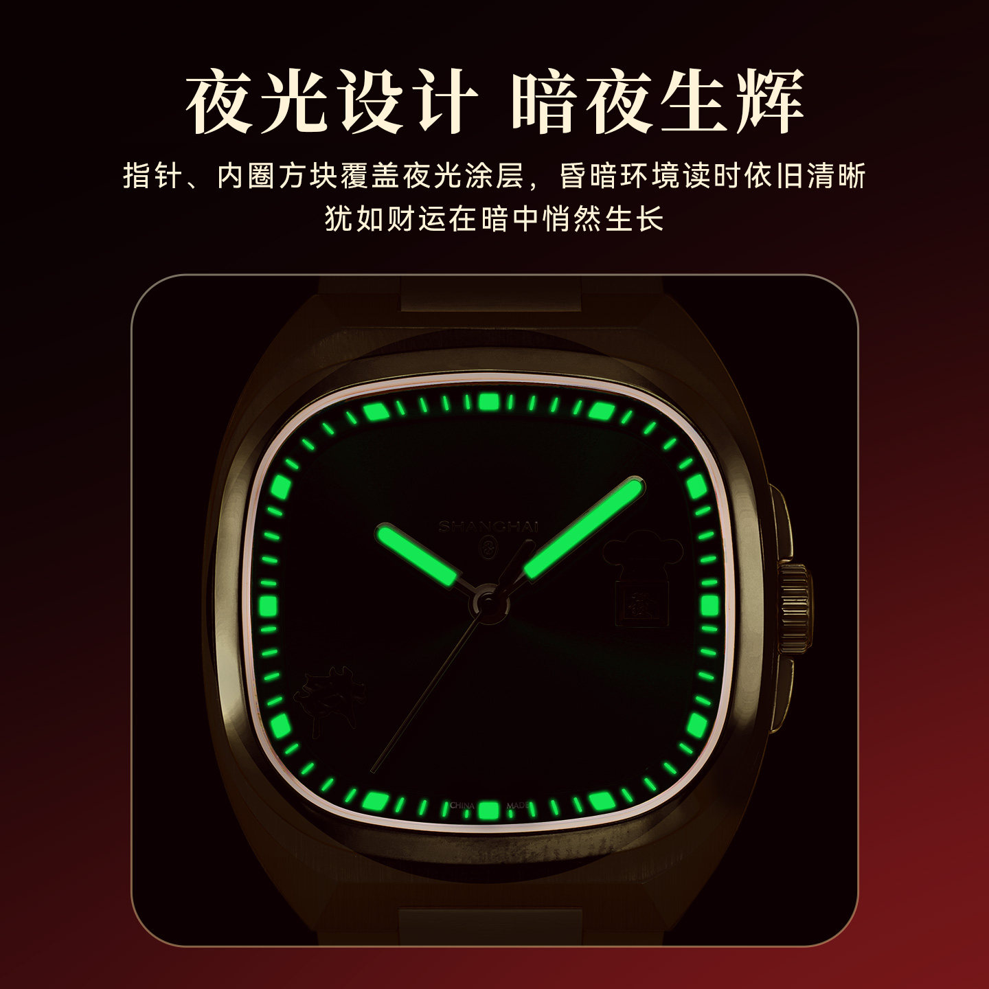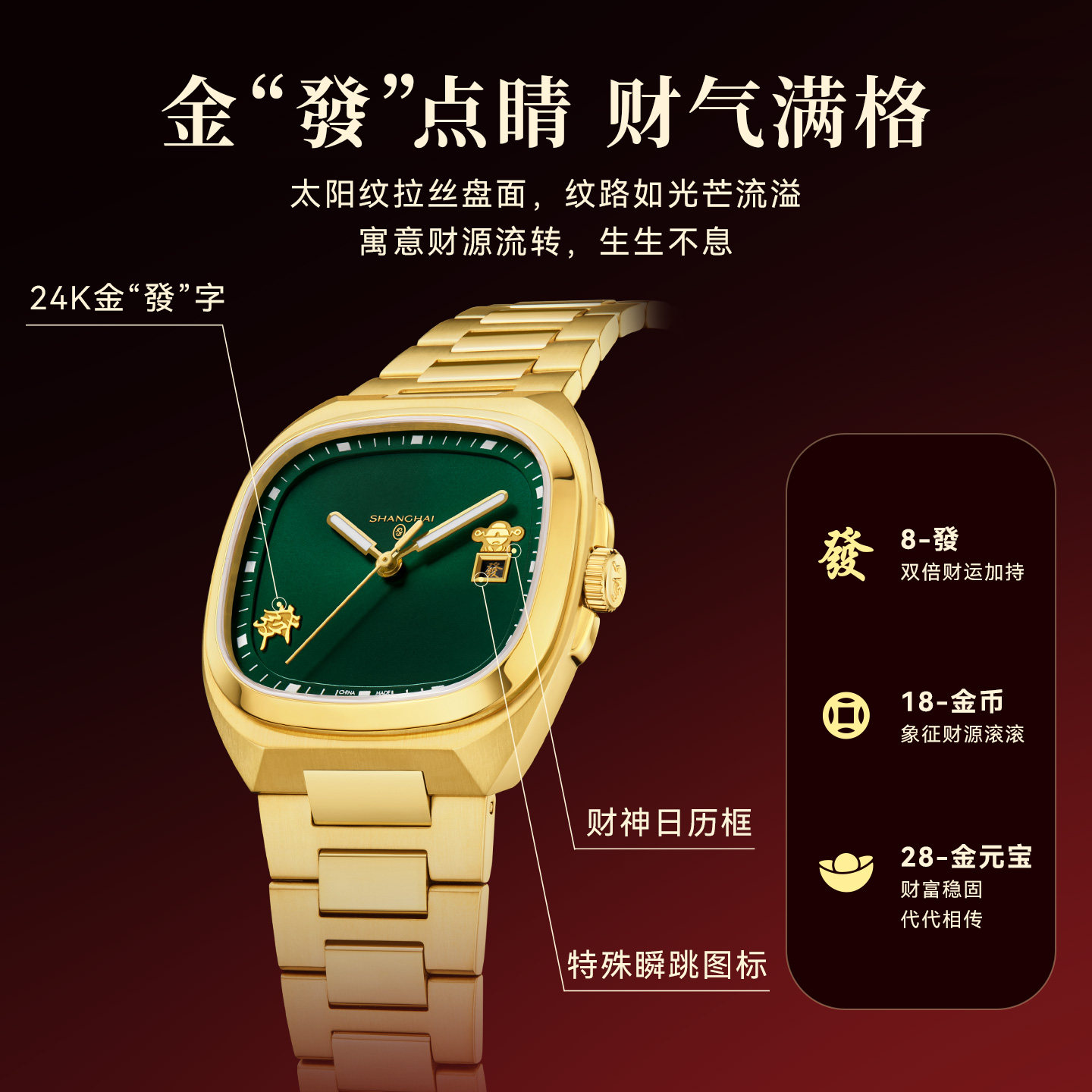 上海表百变小方系列马上發财限量特别版24k金单历夜光男士机械表