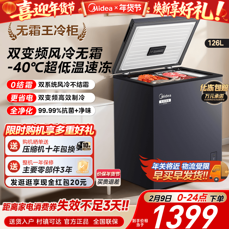【新品】美的126L风冷无霜冰柜家用小型变频冷柜冷藏冷冻一级冰箱