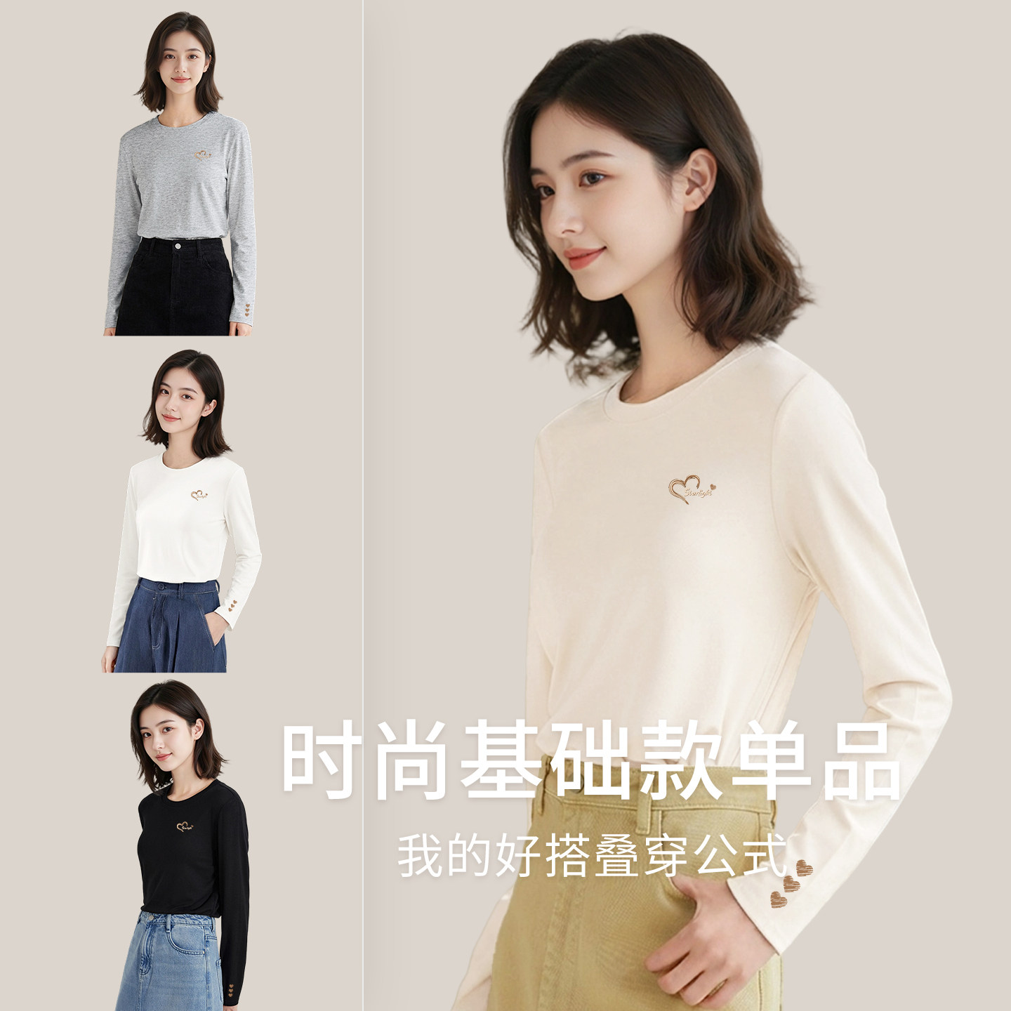 三福长袖上衣女2025新款秋冬季圆领内搭打底衫修身白色t恤女装