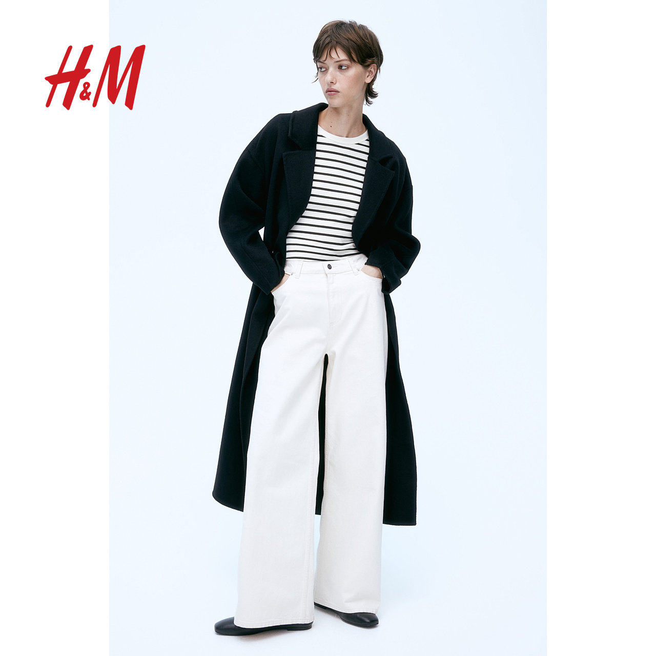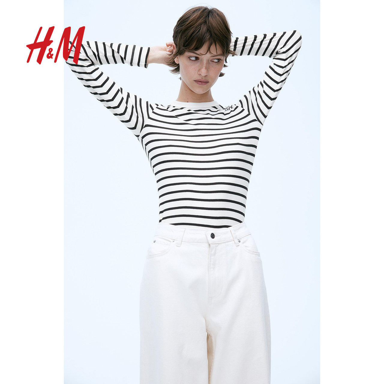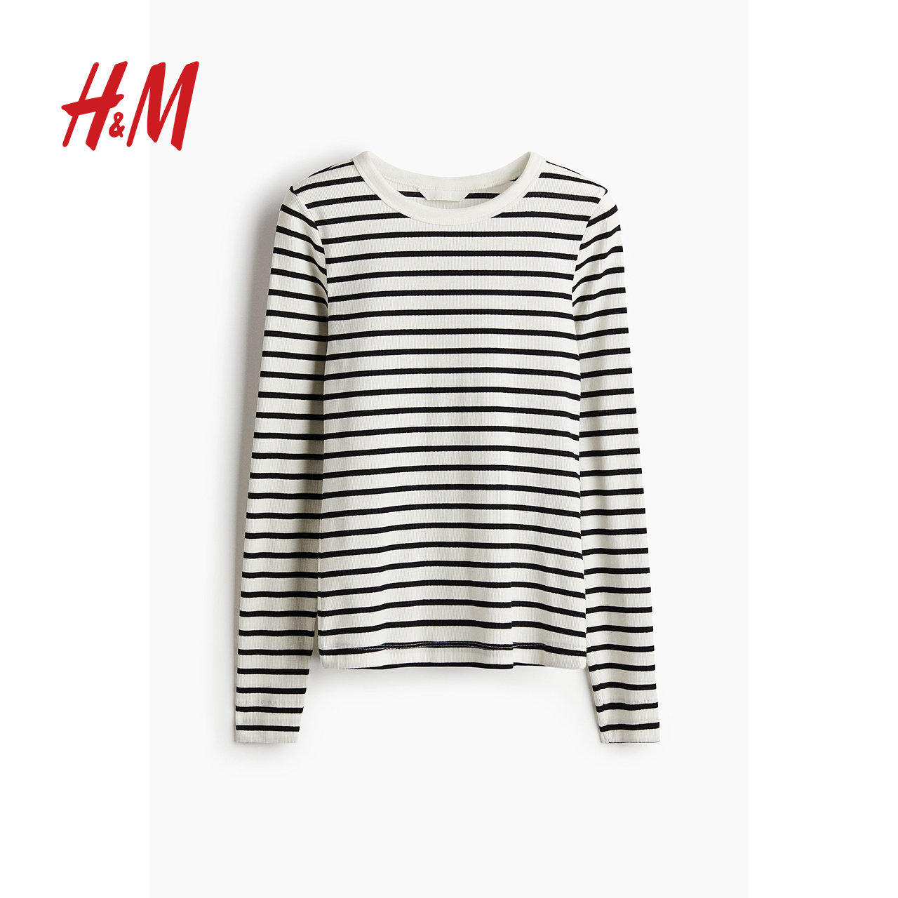 HM女装T恤春季打底衫简约条纹修身显瘦圆领长袖柔软上衣1203084